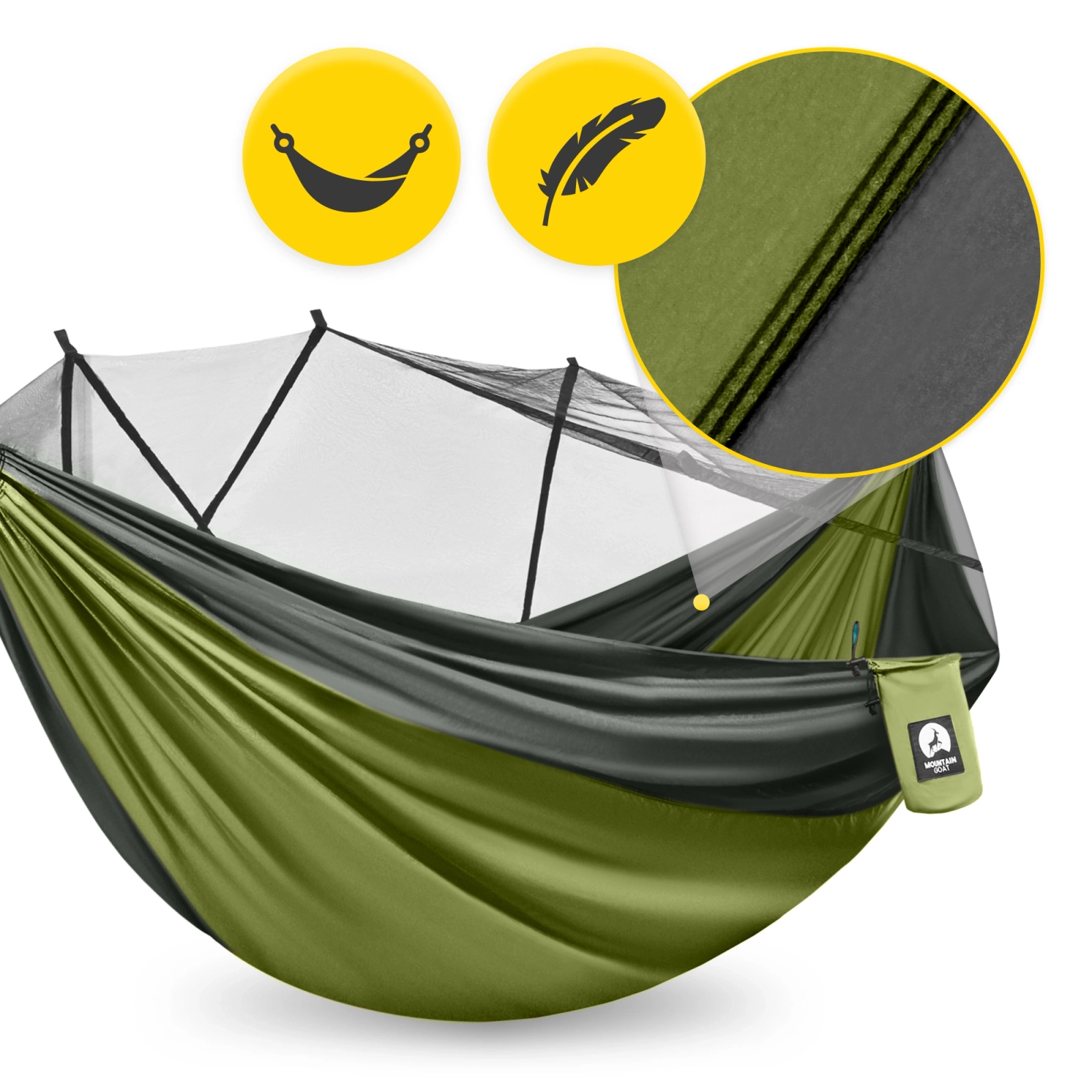 A MOUNTAIN GOAT egyszemélyes függőágy praktikus szúnyoghálóval van ellátva, amely hatékonyan véd a szúnyogok, legyek és egyéb rovarok ellen. Ennek köszönhetően élvezheted a zavartalan pihenést és nyugodt alvást még a sűrű erdőben, kempingezés vagy sátorozás során is.
