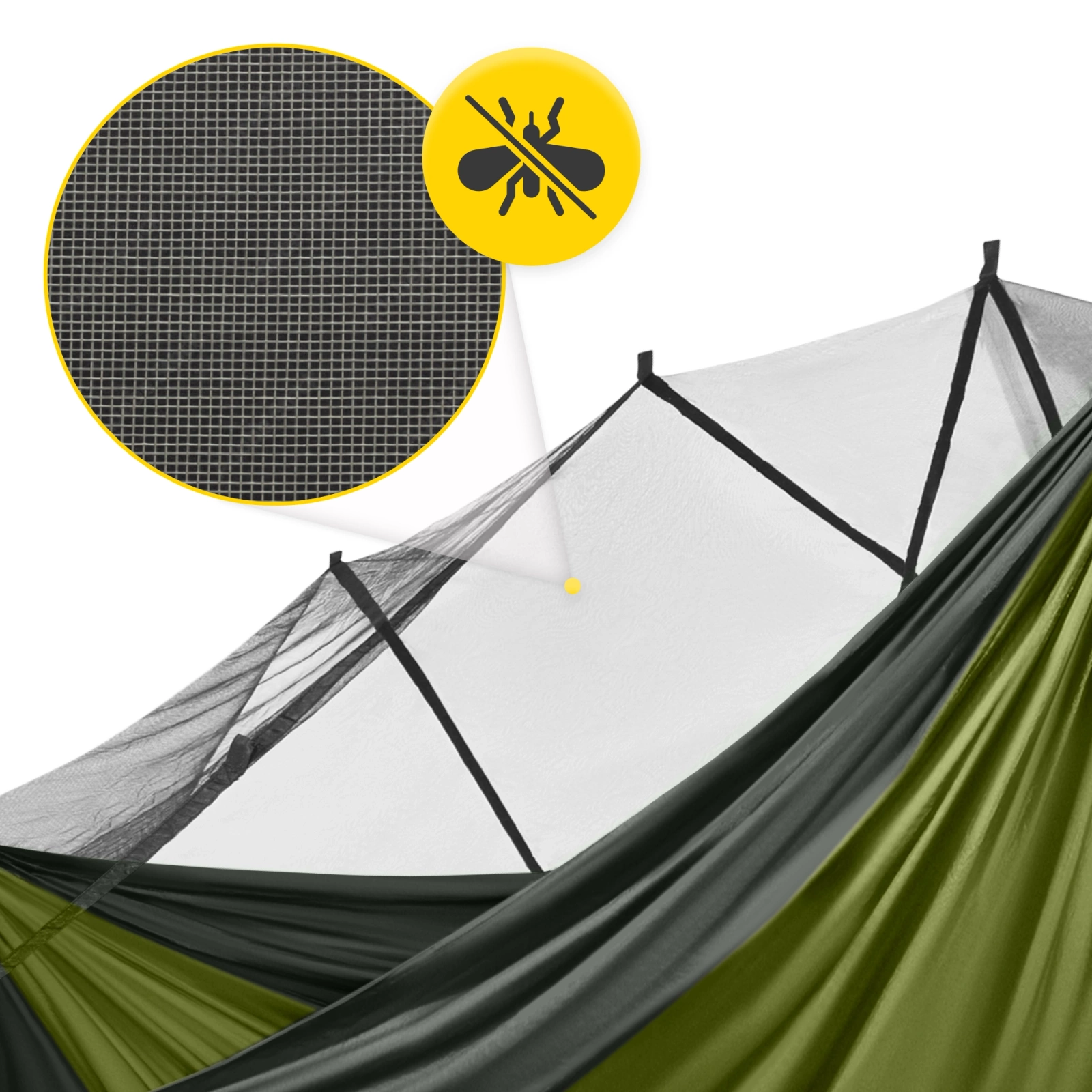 A szúnyogháló finom hálós anyagból készült, amely lehetővé teszi a szabad légáramlást, miközben erős védelmet nyújt a rovarokkal szemben. Ami fontos, hogy a szúnyogháló a függőágyba van építve.