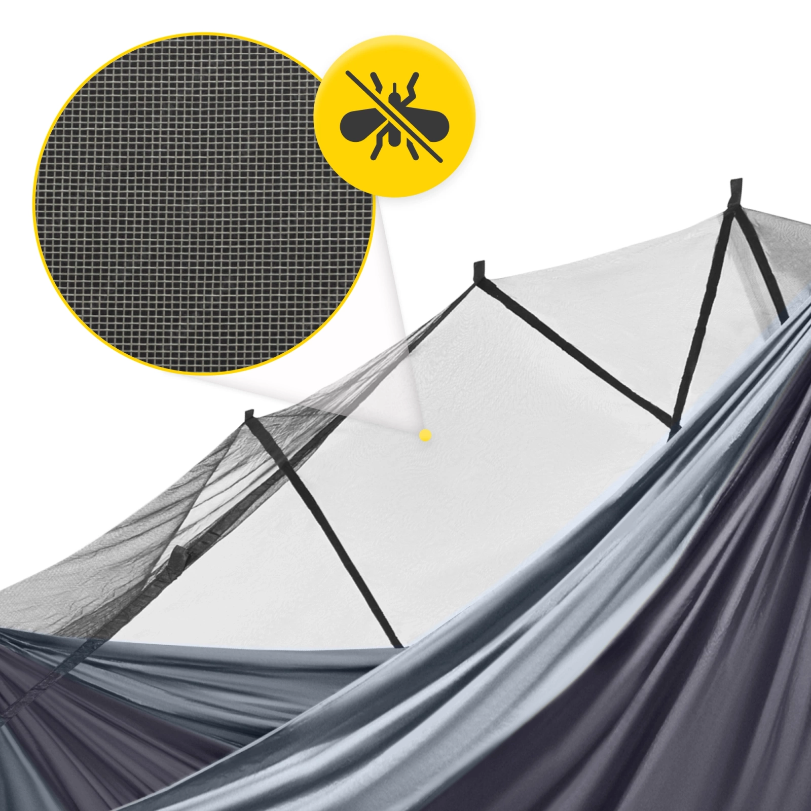 Plasa durabilă este fixată permanent pe hamac, astfel încât nu trebuie să o desfaci de fiecare dată.