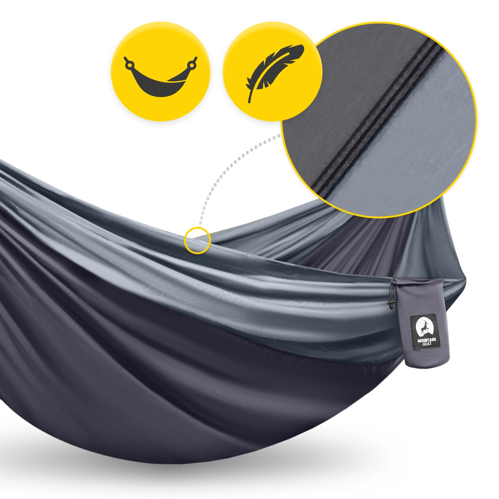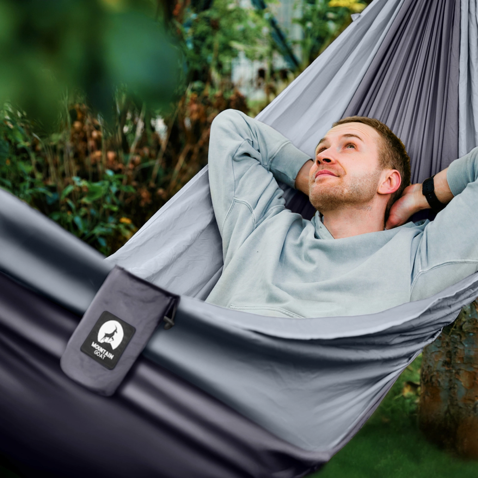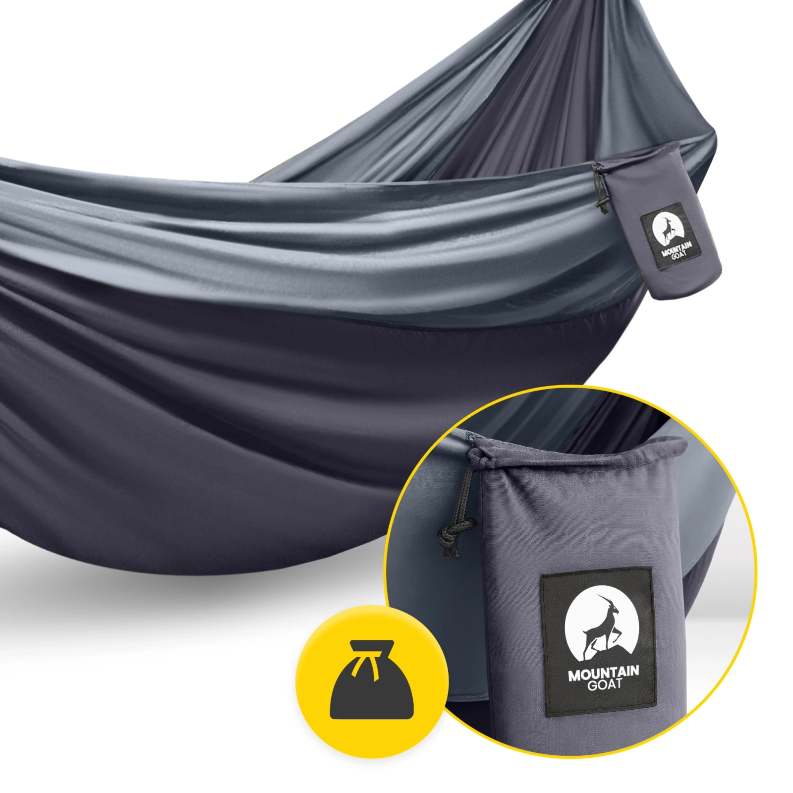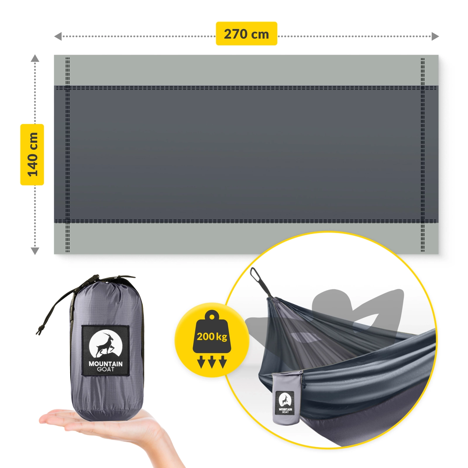 A szetthez mellékelt 2 kötél és rögzítőheveder, valamint a 2 karabiner segítségével könnyedén felállíthatod és rögzítheted a MOUNTAIN GOAT függőágyat.