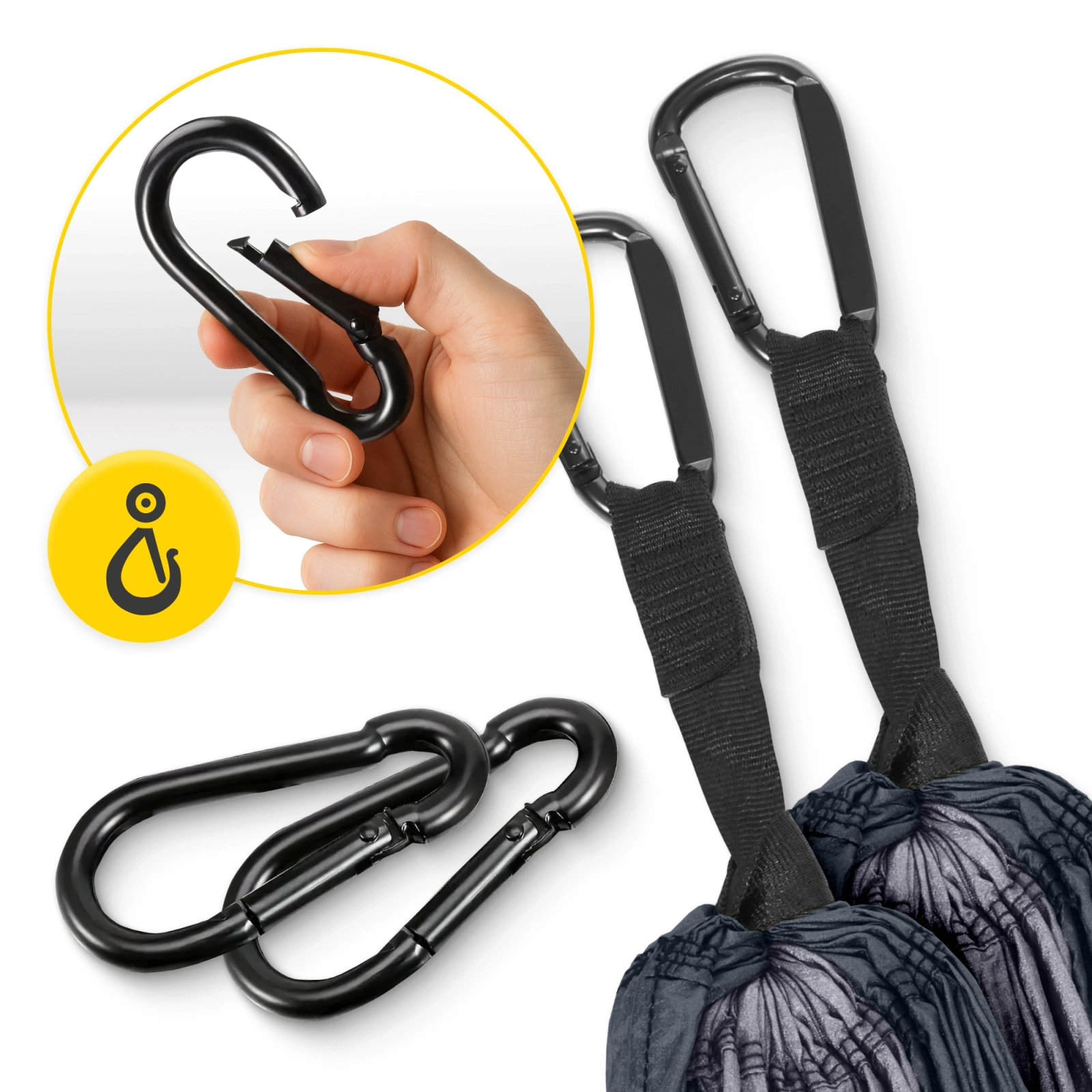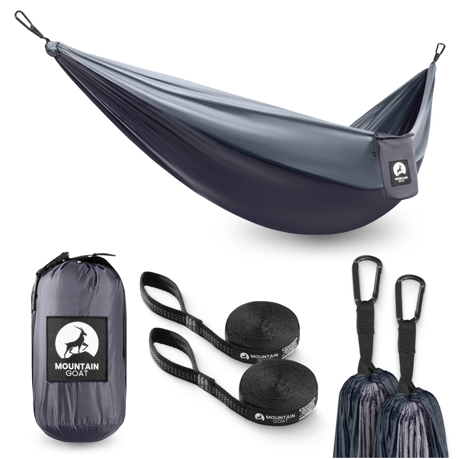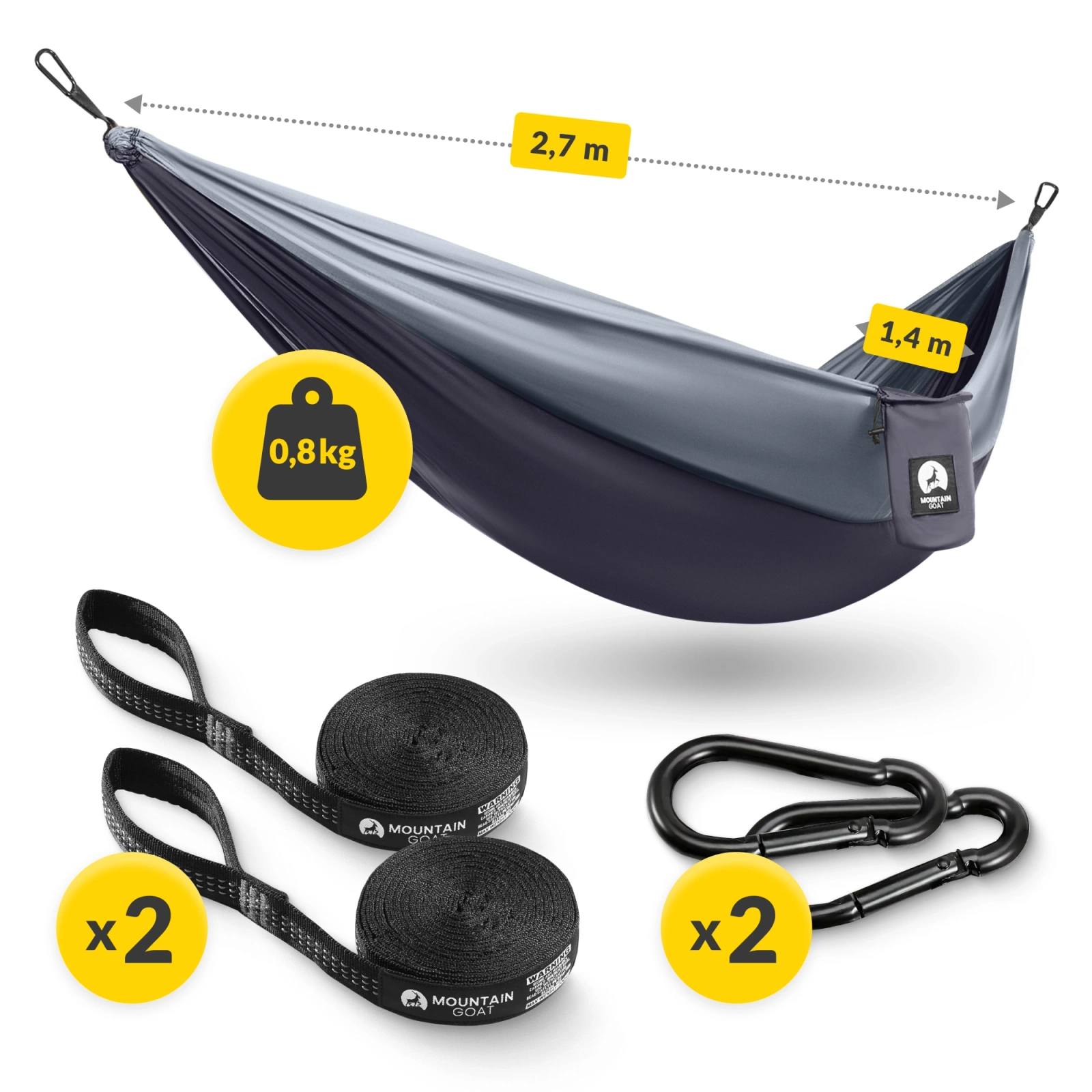 Ha a MOUNTAIN GOAT egyszemélyes függőágyat választod, a szett tartalmazza a hevedereket és a karabinereket, így bárhova problémamentesen felakaszthatod a függőágyat.
