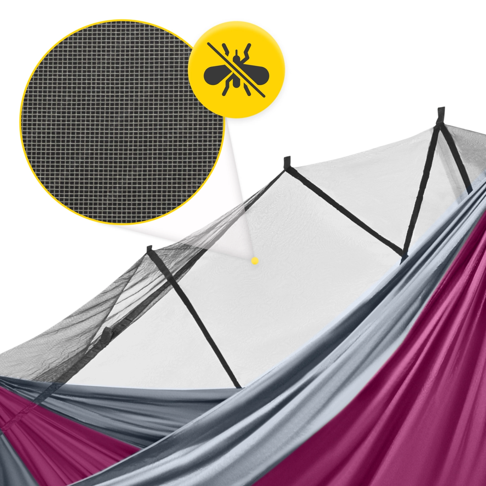 A tartós anyagból készült szúnyogháló hozzá van építve a függőágy szerkezetéhez, így nem kell aggódnod a folyamatos rögzítése miatt.