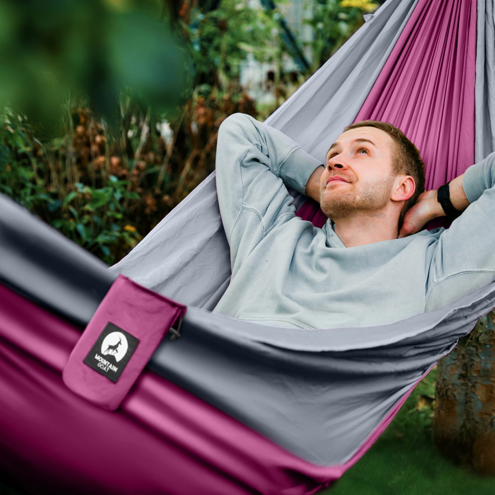 A szetthez mellékelt 2 kötél és rögzítőheveder, valamint a 2 karabiner segítségével könnyedén felállíthatod és rögzítheted a MOUNTAIN GOAT függőágyat.