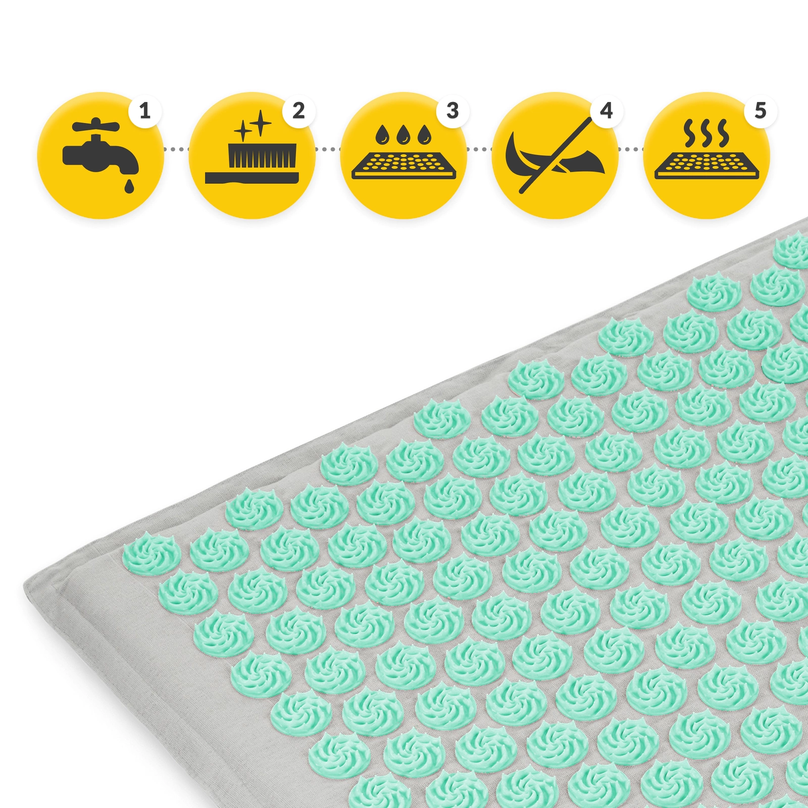 A párnával ellátott 4FIZJO ECO XL tűs akupresszúrás matracot kézzel, langyos vízzel és szappannal mosd. A tűk közötti por eltávolításához használj puha kefét. A végén alaposan öblítsd ki a huzatot. Semmiképpen ne dörzsöld vagy csavard ki az anyagot. A matracot csak laposan szárítsd. Fontos! Az akupresszúrás matracot nem szabad mosógépben mosni, és szárítógépben szárítani. A huzatban a tűk felével befelé feltekerve tárold.