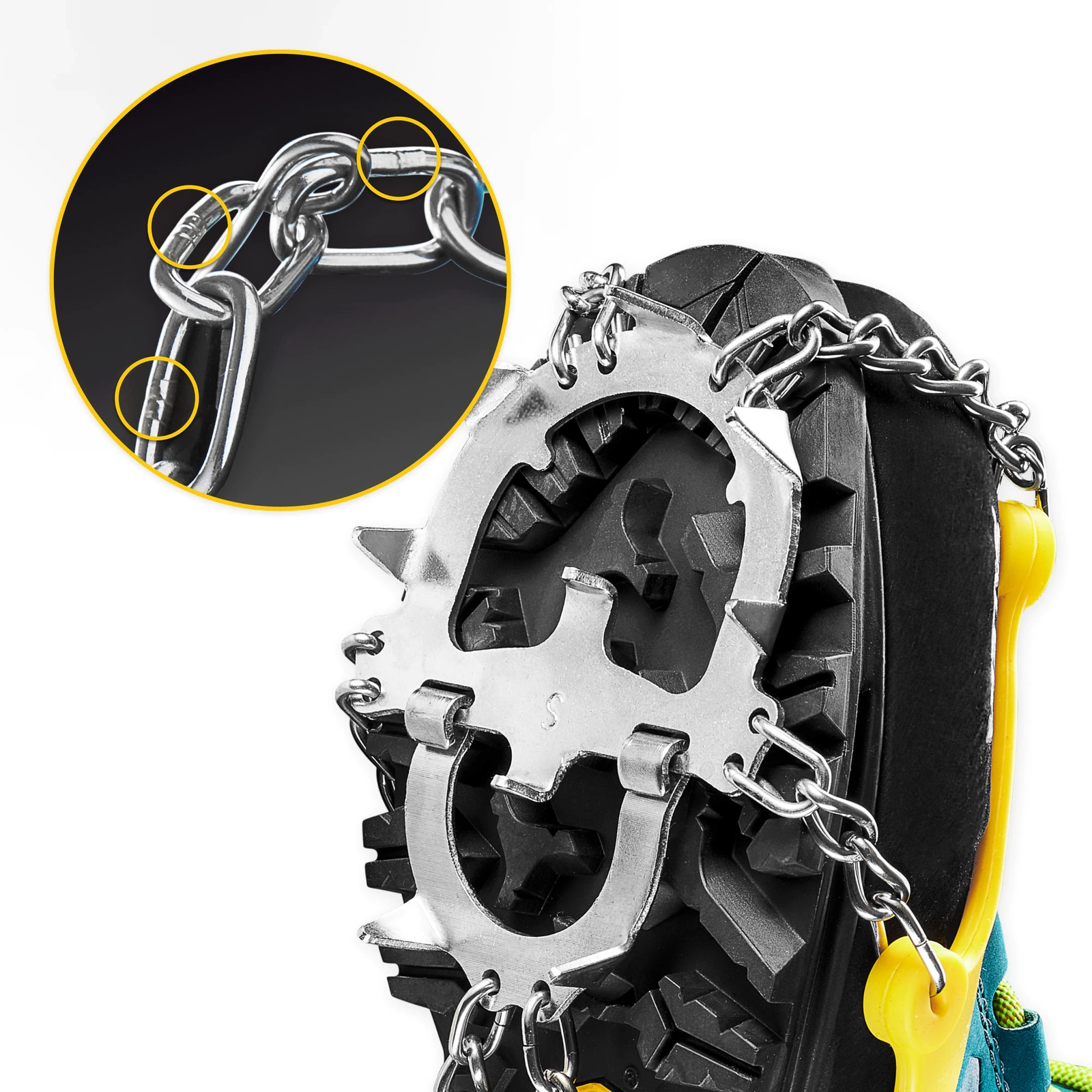 Ennek a túrafelszerelésnek további előnye a univerzális kialakítás. Ez lehetővé teszi, hogy a méret a különböző típusú túracipőkhöz igazodjon. A jobb pozicionálást és a kramponok biztonságos tartását a lábon a tépőzárral ellátott textil pántok biztosítják. Ez a fajta rögzítés könnyen felszerelhető, és lehetővé teszi minden beállítást a lábbeli szélességéhez. A jó tapadást speciális zsanérok és megerősített láncok biztosítják. Ennek köszönhetően szilárdan harapnak a fagyott talajba. A zsanérok megakadályozzák, hogy a lábfej váratlanul leváljon a felszínről, javított stabilitást biztosítva járás közben.
