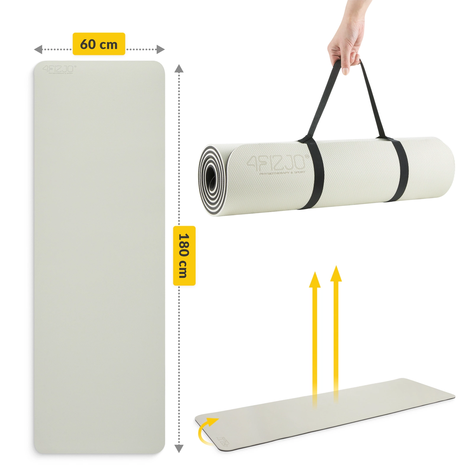 A TPE rugalmas és elasztikus anyag, amelynek puha felülete gyémántmintázattal készült, így a gumi tökéletes kényelmet nyújt edzés közben, és segíti a könnyű átmenetet a különböző pozíciók között. Ráadásul a 180 × 60 cm-es 4FIZJO jógaszőnyeg rendkívül könnyű, valamint ellenáll a magas és alacsony hőmérsékleteknek.