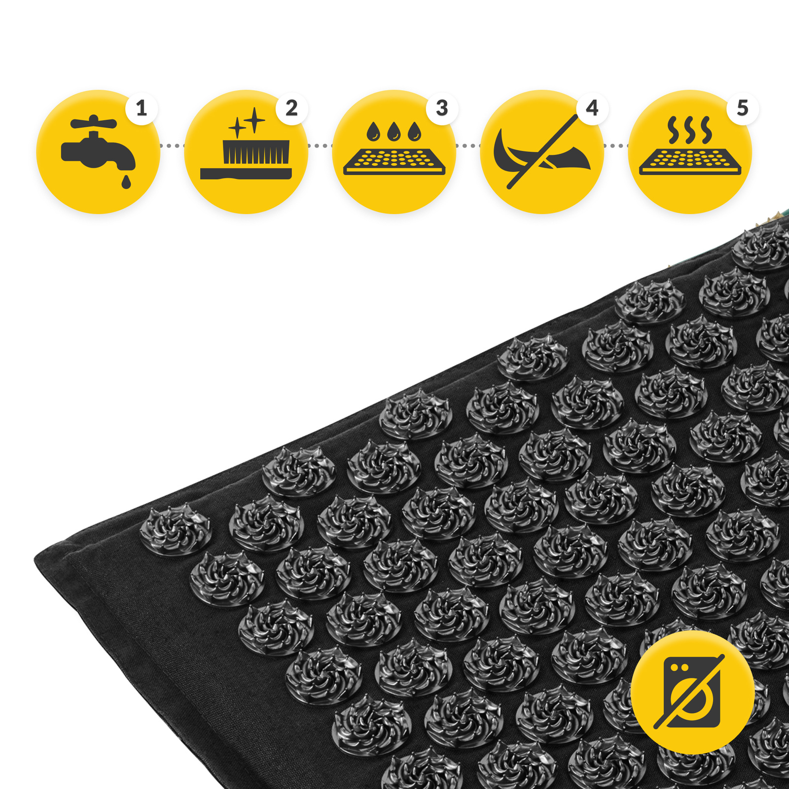 Az ECO 4FIZJO szöges és párnázott akupresszúrás szőnyeget kézzel, langyos szappanos vízzel mossa ki. A tüskék közötti terekből a por eltávolításához használjon puha kefét. Végül alaposan öblítse ki a burkolatot. Semmilyen körülmények között ne dörzsölje vagy nyomja össze az anyagot. Kizárólag laposan szárítsa. Ne feledje, az akupresszúrás szőnyeg nem mosható gépben vagy szárítógépben. Tárolja a huzatban feltekerve, a tüskékkel a belsejében.