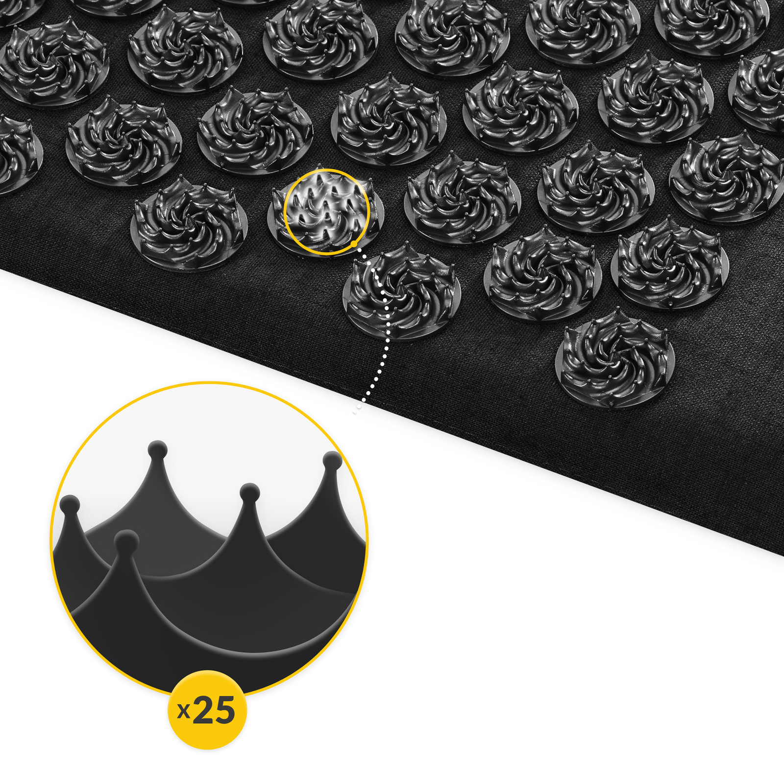 A SPINNING SPIKES az a technológia, amelyben a tüskék készültek. Ezeket az ECO szőnyegbe ragasztották a HEAT PRESS ragasztás nélküli Módszerrel. Örvény alakúak, ami még jobb fasciális ellazulást és vérkeringést tesz lehetővé az egész testben. A ABS műanyagból készült tüskék nem mérgezőek, hipoallergének és nem irritálják a bőrt. Élesek, de tompa hegyűek, hogy biztonságosak legyenek számára.