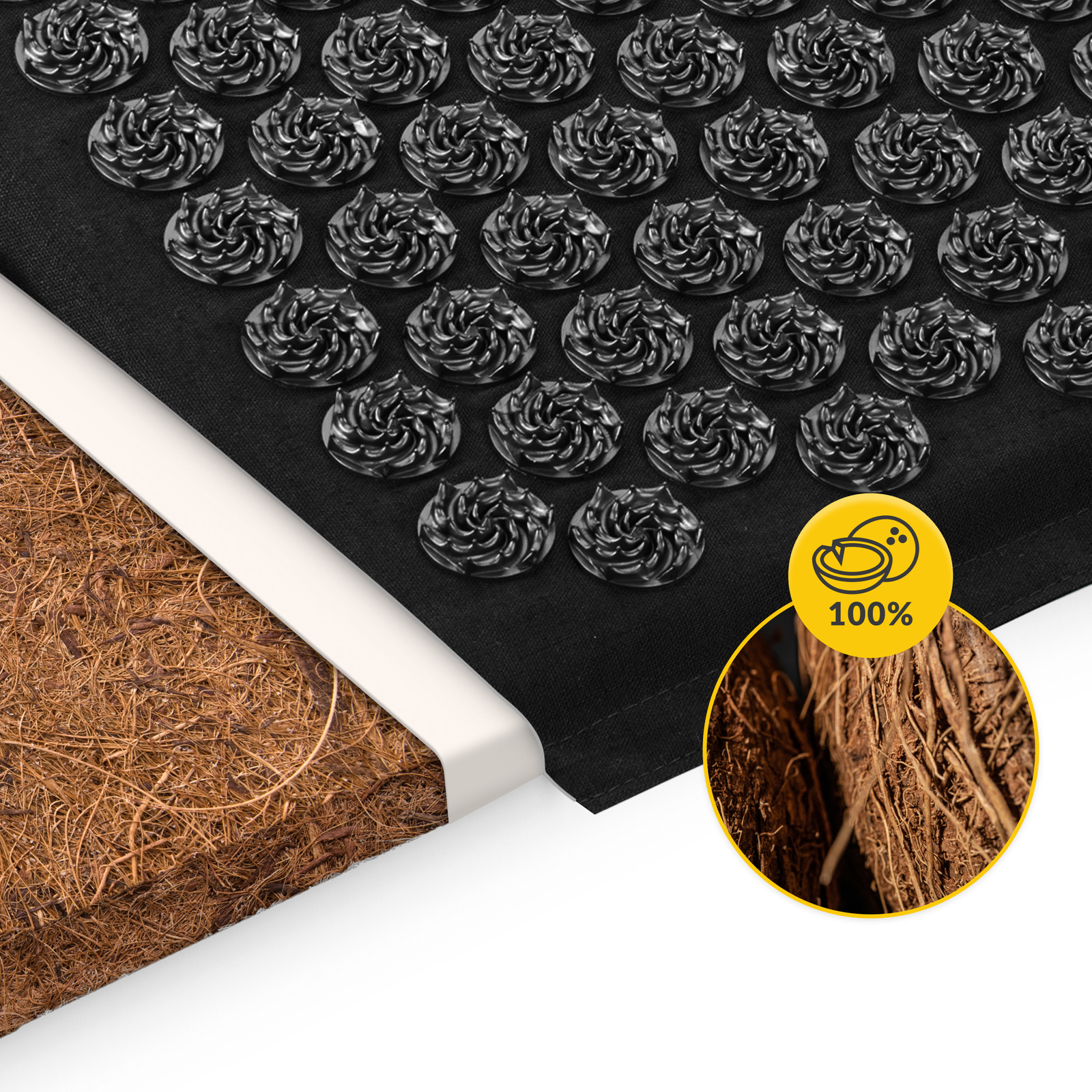 Az ECO 4FIZJO akupresszúrás szőnyeg párnával a legmagasabb minőségű prémium termék. Gyártásához környezetbarát természetes anyagokat használtak fel. A paplanhuzatot 100%-os vászonból varrták. Ez a finom és puha tapintású természetes anyag légáramlást és megfelelő légkeringést biztosít. A kényelmet és a könnyű fekvést vagy ülést a búzahéj és a kókuszrostok biztosítják, amelyek a szőnyeget és a párnát töltik ki.