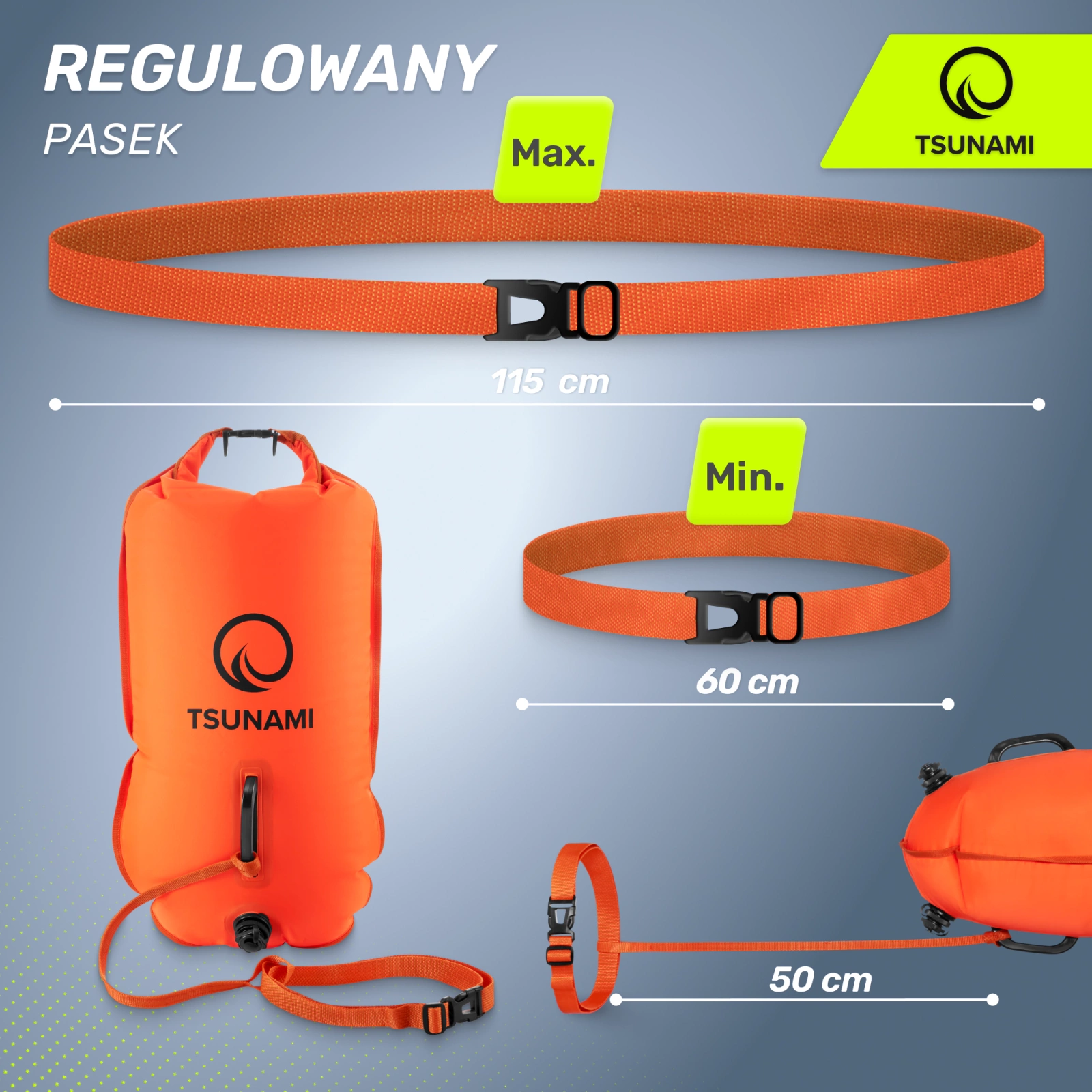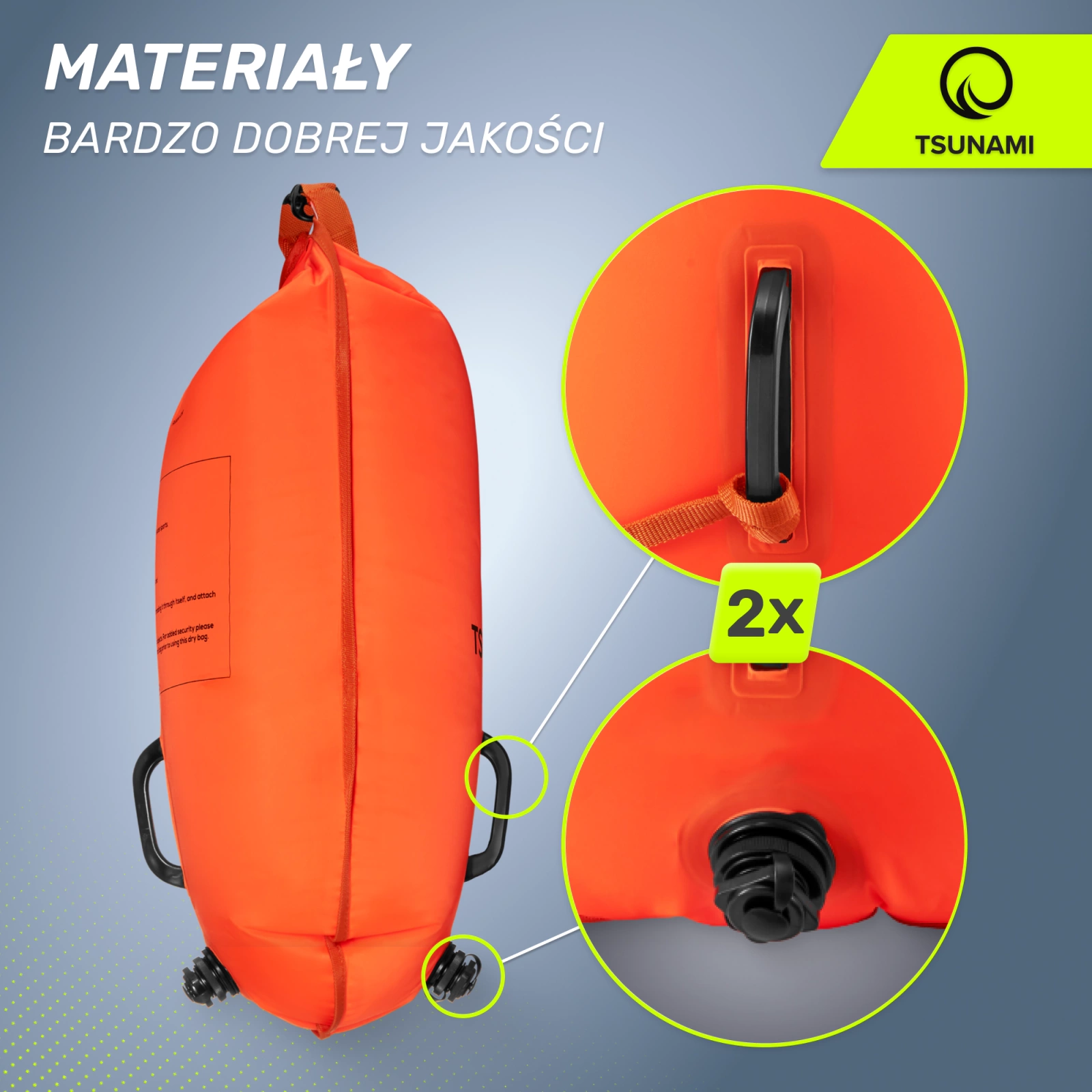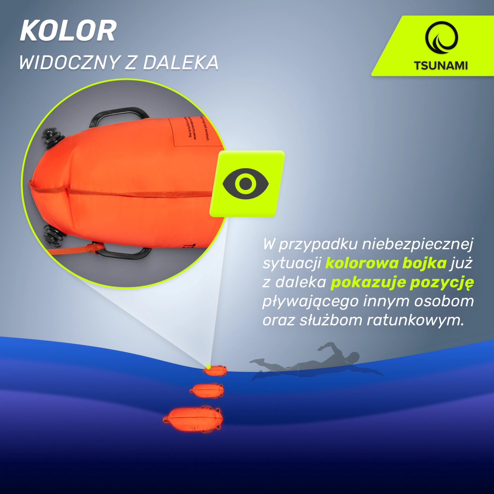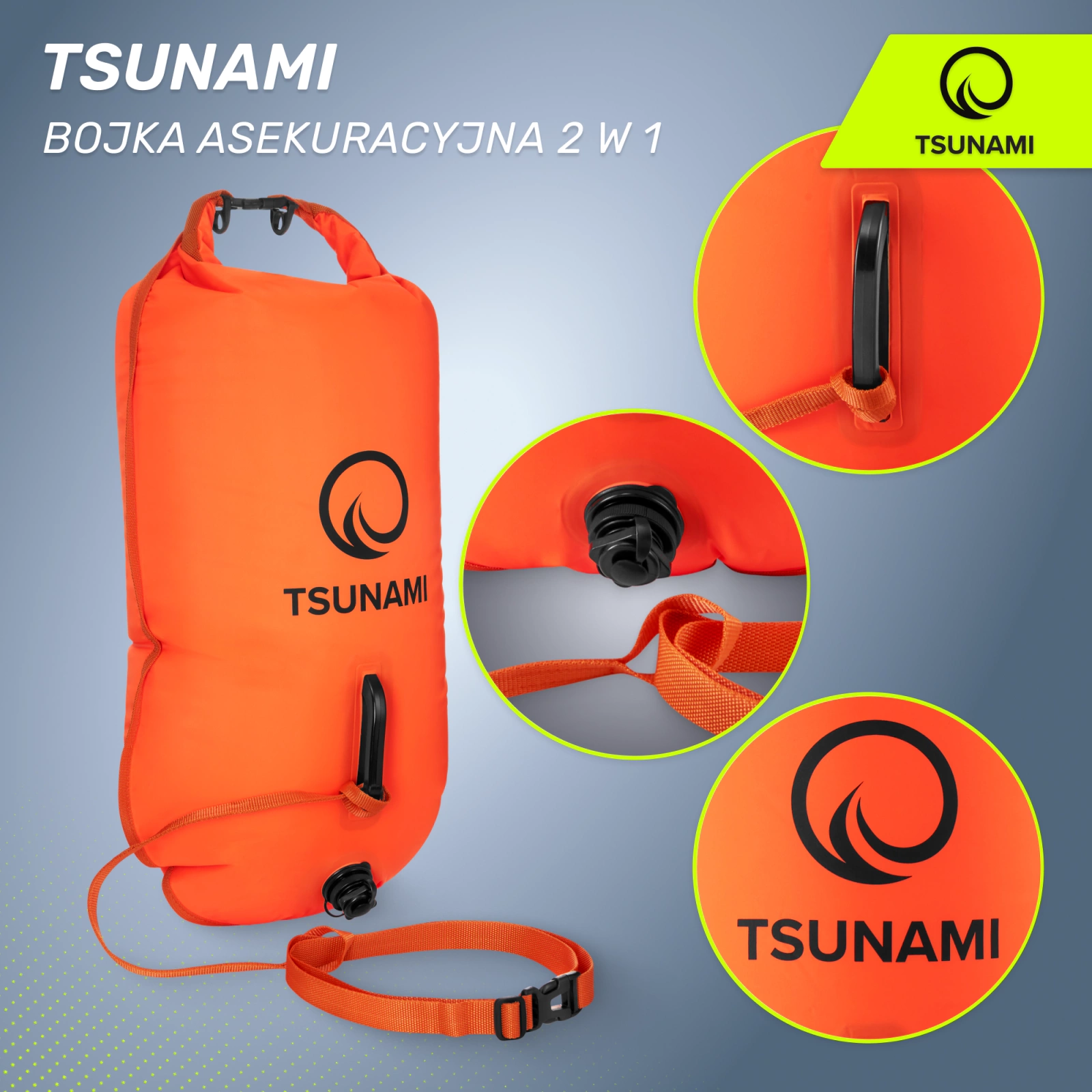 Biztosítsa biztonságát és kényelmét úszóedzés vagy szabadidős úszás közben a nyílt vízben. Ússzon egy felfújható bójával, amely növeli a vízben való láthatóságát, és görcs vagy váratlan erőcsökkenés esetén támpontot nyújt. A biztonság az úszás sarokköve, és a TSUNAMI mentőbója, maximálisan növeli ezt! Kényelmes a használata. A pumpáláshoz két kamerával rendelkezik, és a használatra való előkészítése körülbelül egy percet vesz igénybe.
