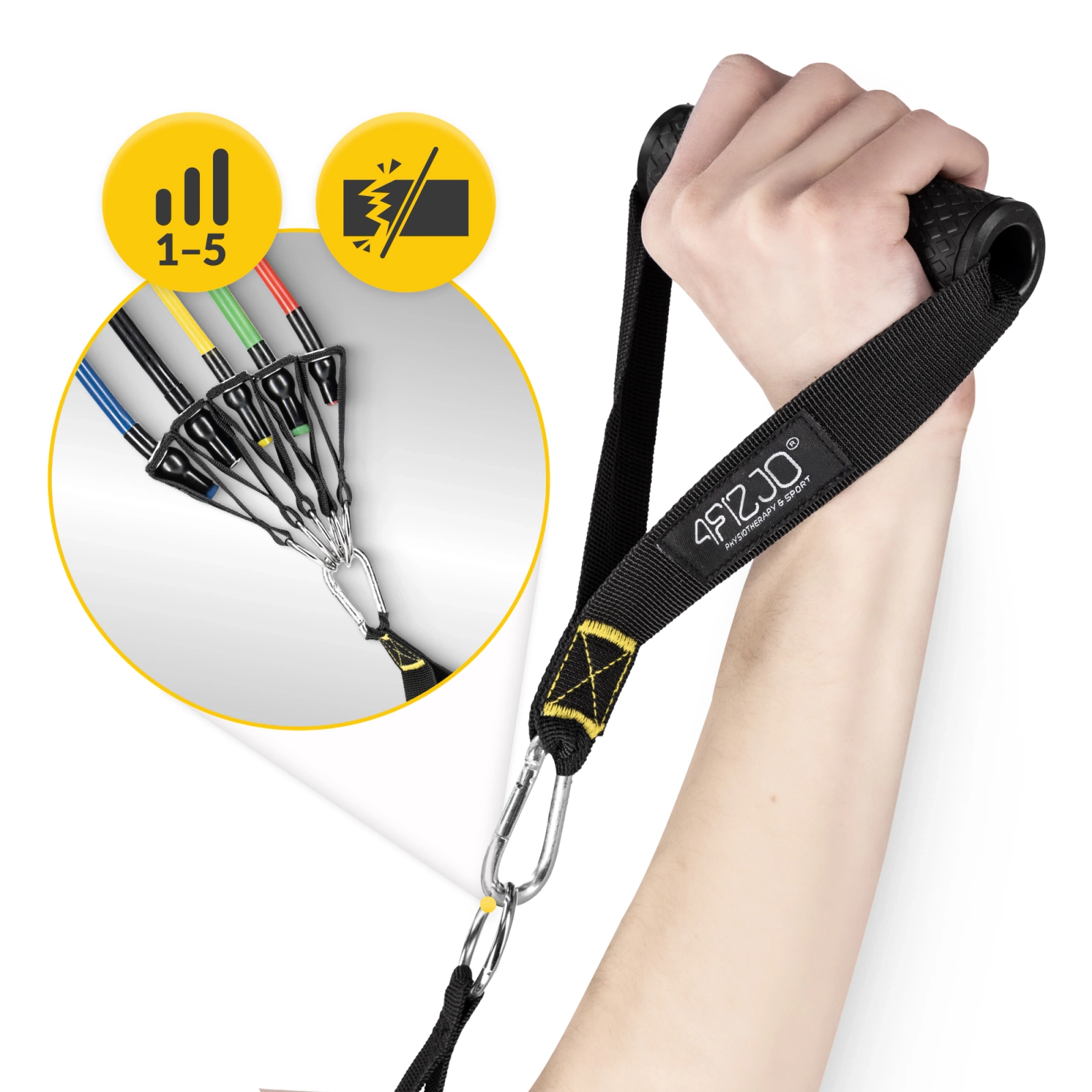 ▶️ 5 különböző ellenállású gumi, amelyek lehetővé teszik az edzés intenzitásának beállítását.