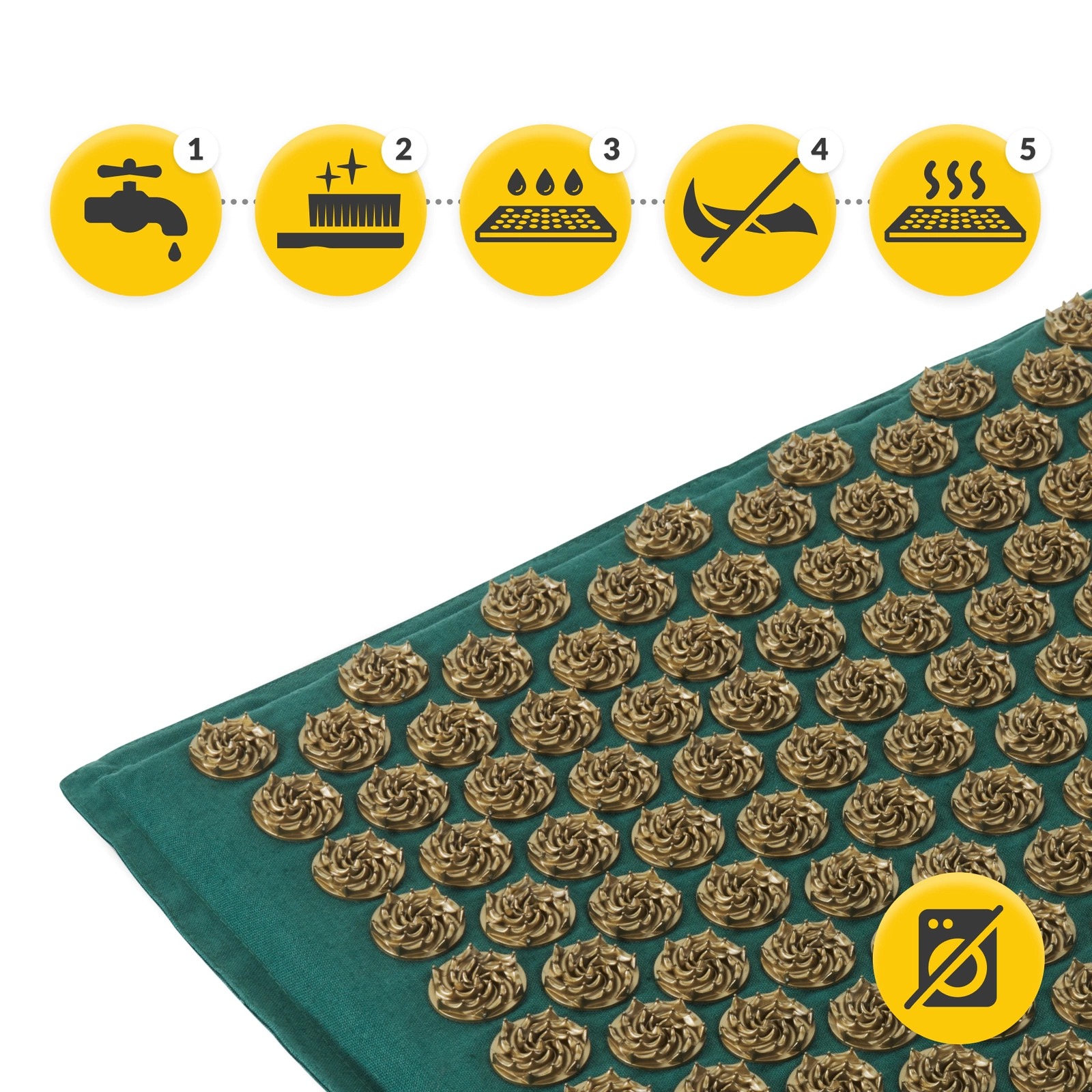 Az ECO 4FIZJO szöges és párnázott akupresszúrás szőnyeget kézzel, langyos szappanos vízzel mossa ki. A tüskék közötti terekből a por eltávolításához használjon puha kefét. Végül alaposan öblítse ki a burkolatot. Semmilyen körülmények között ne dörzsölje vagy nyomja össze az anyagot. Kizárólag laposan szárítsa. Ne feledje, az akupresszúrás szőnyeg nem mosható gépben vagy szárítógépben. Tárolja a huzatban feltekerve, a tüskékkel a belsejében.