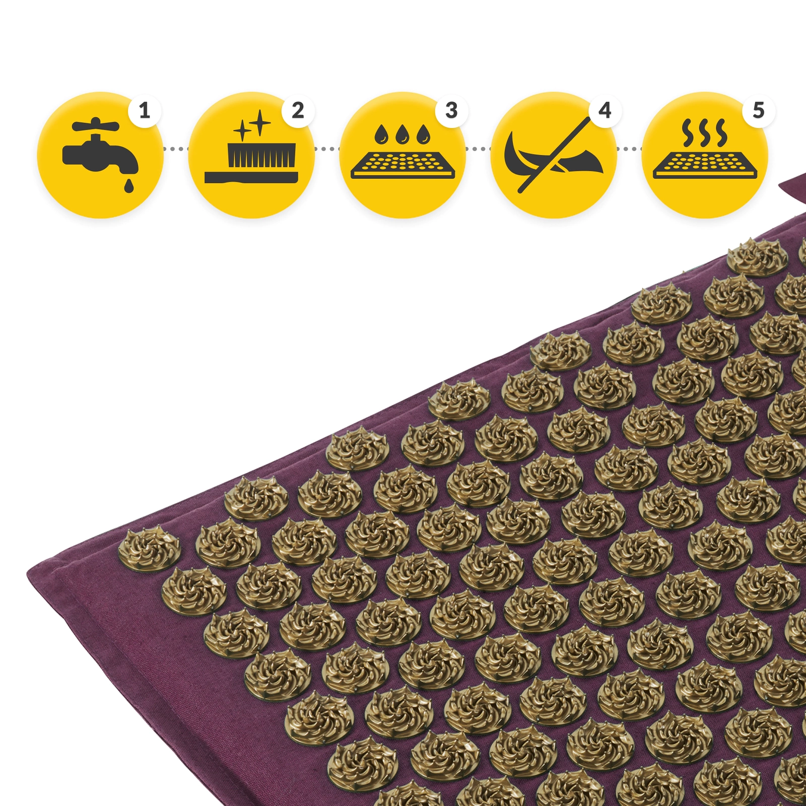 Az ECO 4FIZJO szöges és párnázott akupresszúrás szőnyeget kézzel, langyos szappanos vízzel mossa ki. A tüskék közötti terekből a por eltávolításához használjon puha kefét. Végül alaposan öblítse ki a burkolatot. Semmilyen körülmények között ne dörzsölje vagy nyomja össze az anyagot. Kizárólag laposan szárítsa. Ne feledje, az akupresszúrás szőnyeg nem mosható gépben vagy szárítógépben. Tárolja a huzatban feltekerve, a tüskékkel a belsejében.