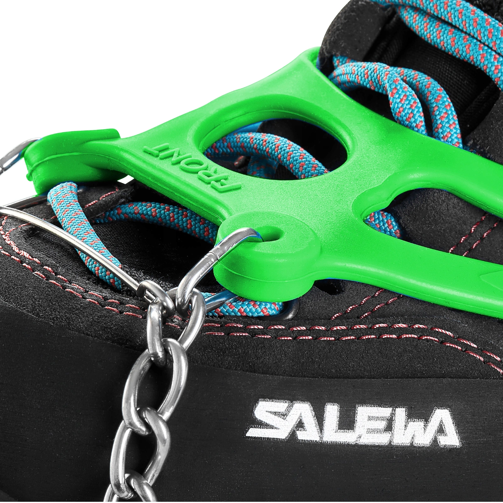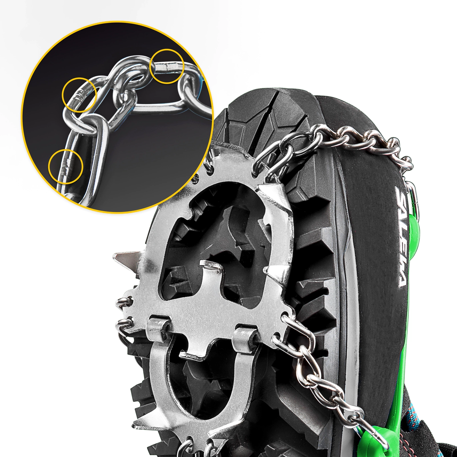 Ennek a túrafelszerelésnek további előnye a univerzális kialakítás. Ez lehetővé teszi, hogy a méret a különböző típusú túracipőkhöz igazodjon. A jobb pozicionálást és a kramponok biztonságos tartását a lábon a tépőzárral ellátott textil pántok biztosítják. Ez a fajta rögzítés könnyen felszerelhető, és lehetővé teszi minden beállítást a lábbeli szélességéhez. A jó tapadást speciális zsanérok és megerősített láncok biztosítják. Ennek köszönhetően szilárdan harapnak a fagyott talajba. A zsanérok megakadályozzák, hogy a lábfej váratlanul leváljon a felszínről, javított stabilitást biztosítva járás közben.