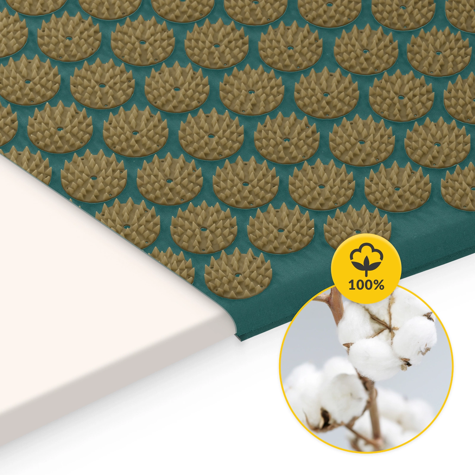 A 4FIZJO akupresszúrás szőnyeg párnával a legmagasabb minőségű prémium termék. A párnahuzat varrásához 100% pamut került felhasználásra. Ez a finom és puha tapintású természetes anyag légáramlást és megfelelő légkeringést biztosít. Ezáltal a szőnyeg egyszerre bőr- és környezetbarát. A fekvés vagy ülés kényelmét és komfortját a szőnyeg borítását és párnáit kitöltő puha hab biztosítja.