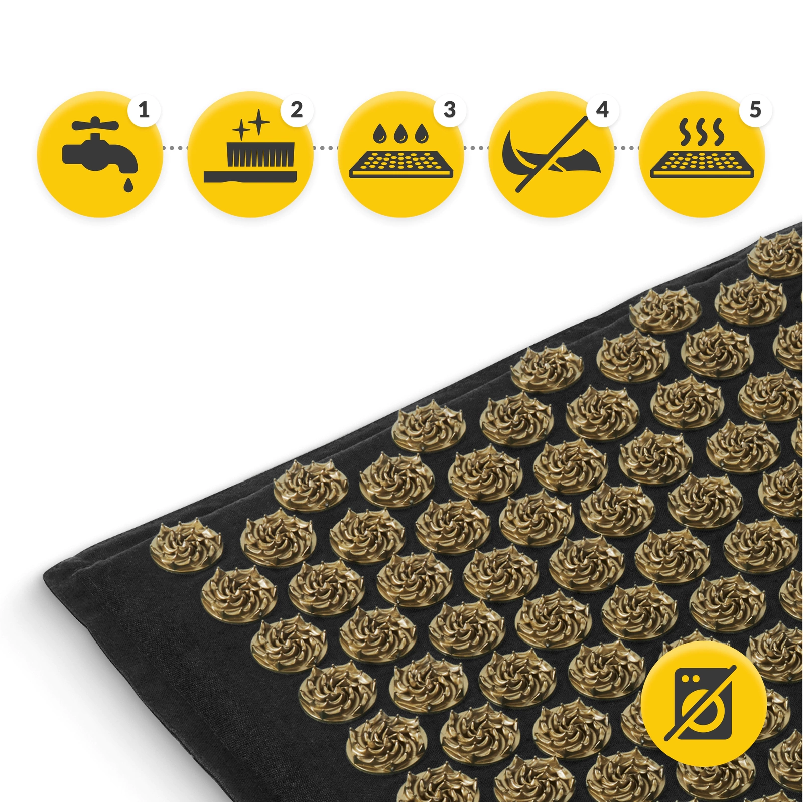 A párnával ellátott 4FIZJO ECO XL tűs akupresszúrás matracot kézzel, langyos vízzel és szappannal mosd. A tűk közötti por eltávolításához használj puha kefét. A végén alaposan öblítsd ki a huzatot. Semmiképpen ne dörzsöld vagy csavard ki az anyagot. A matracot csak laposan szárítsd. Fontos! Az akupresszúrás matracot nem szabad mosógépben mosni, és szárítógépben szárítani. A huzatban a tűk felével befelé feltekerve tárold.