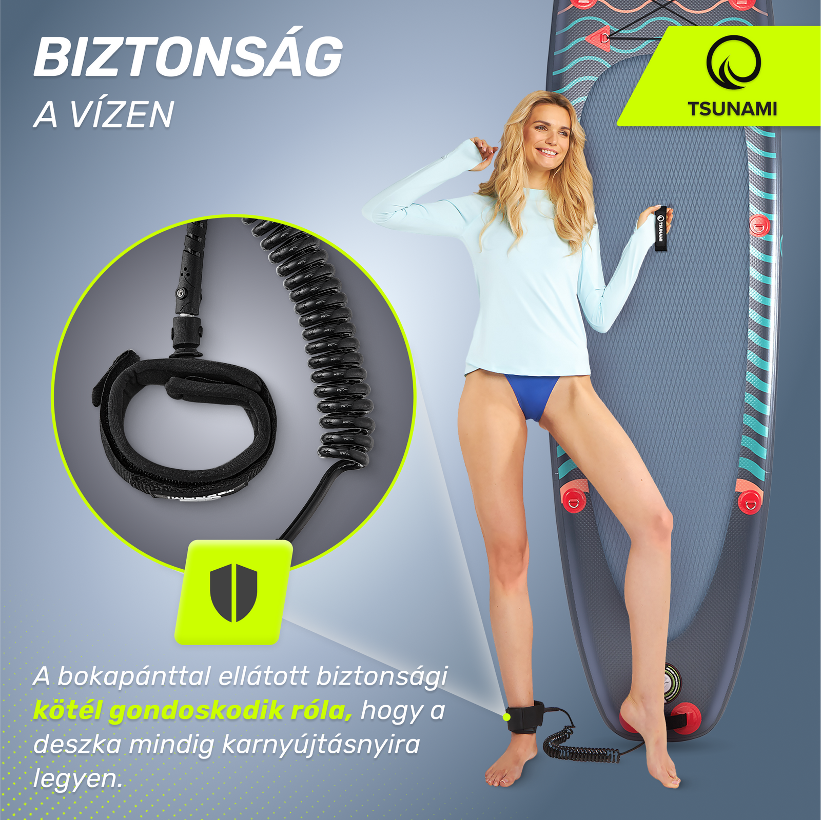 A vízen – csakúgy, mint más sportokban – a biztonság az első. Kontrasztos elemek növelik a láthatóságot távolról is. Az ideális hossz–szélesség arány nagy stabilitást és kevesebb esésveszélyt jelent. Ha mégis belezuhannál a vízbe, a bokahevederrel rögzített deszka nem úszik el – mindig kéznél lesz.