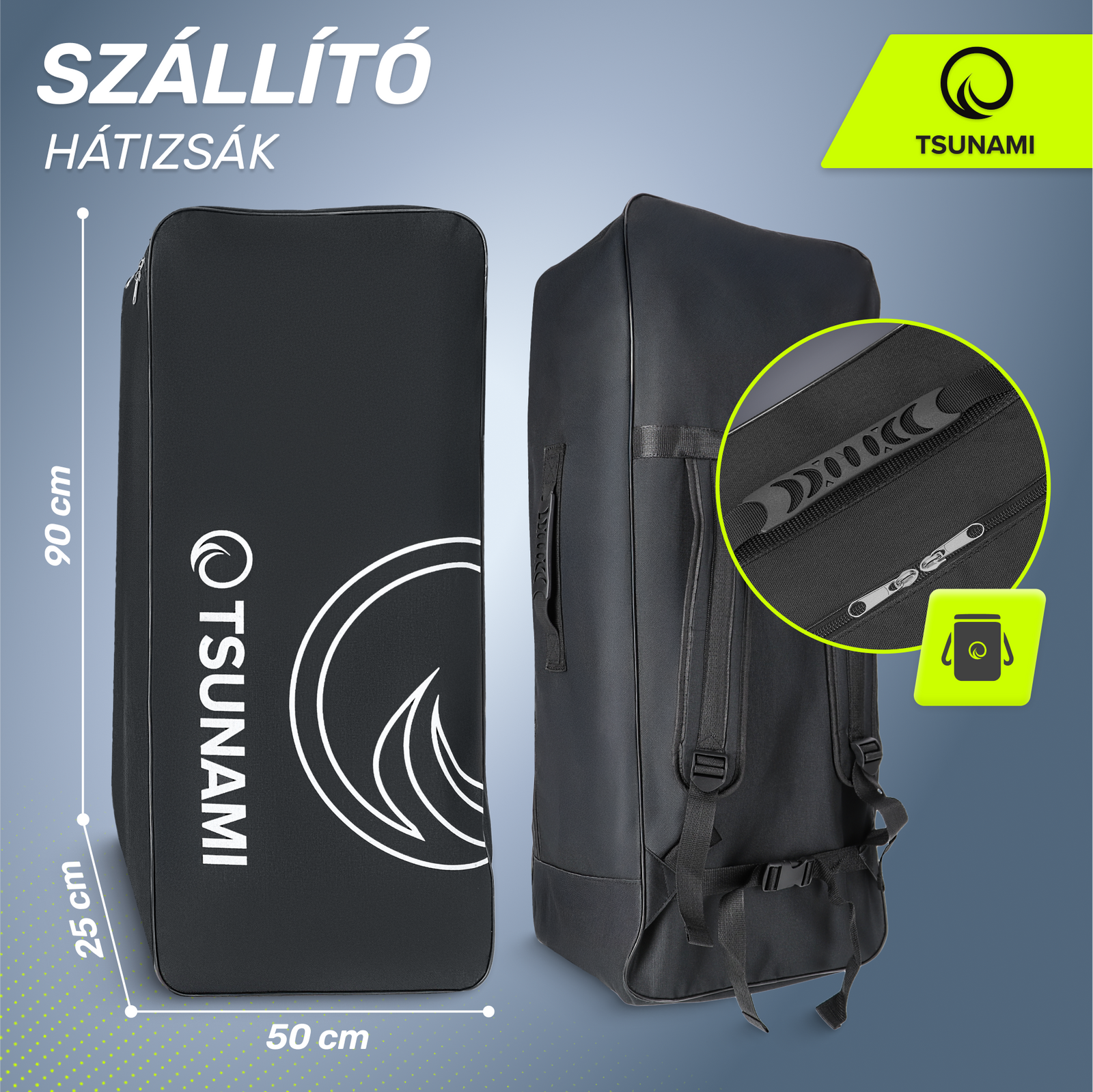 A TSUNAMI SUP deszka kétszintes DWF anyagból készül, amelyet belül több ezer Drop‑stitch szál erősít. Ez megnöveli a hőmérsékletingadozással és sérülésekkel szembeni ellenálló képességet – nem kell félned a csapástól. A deszka hossza akár 350 cm, ami segíti az evezést és csökkenti az orr sodródását – ideális kezdők számára is.