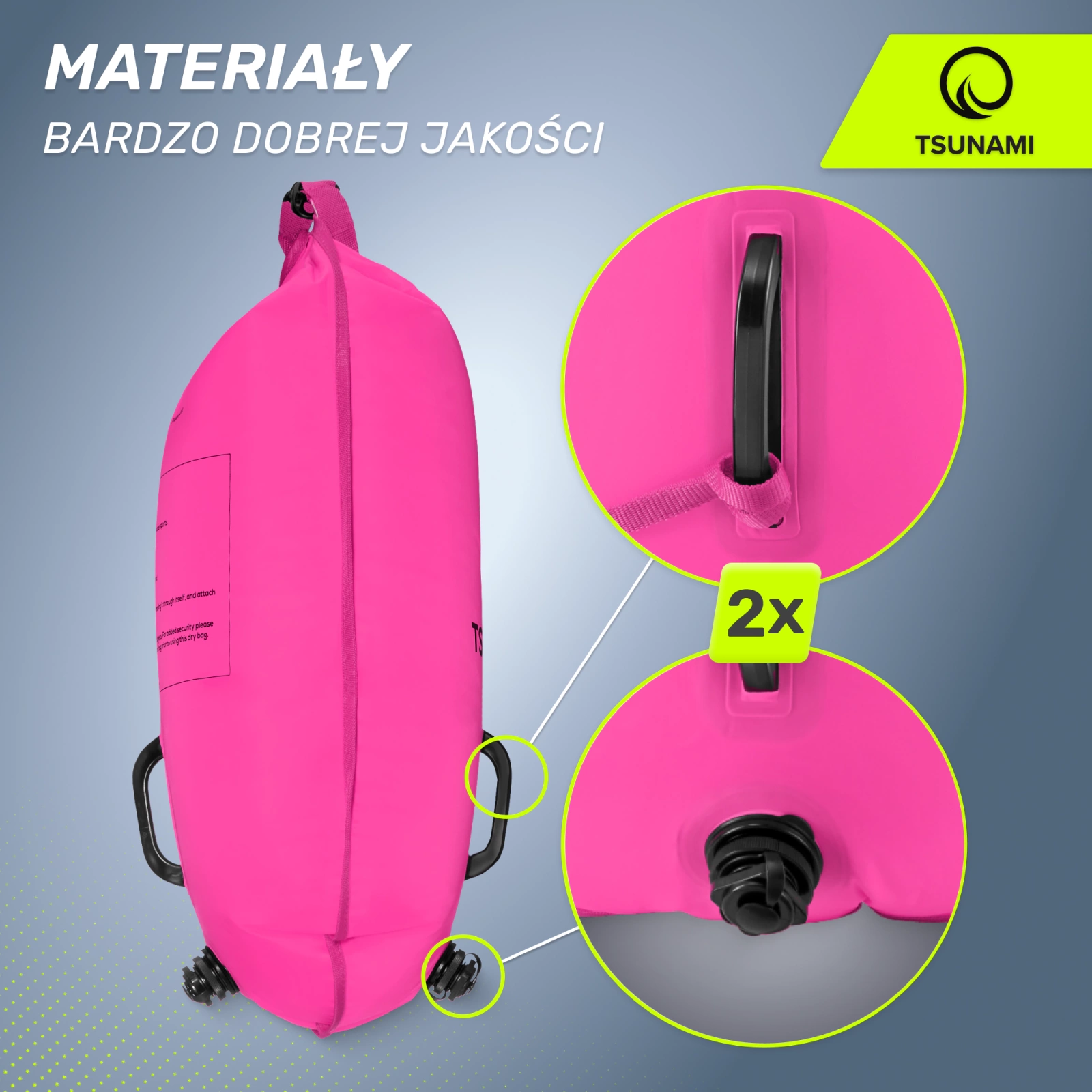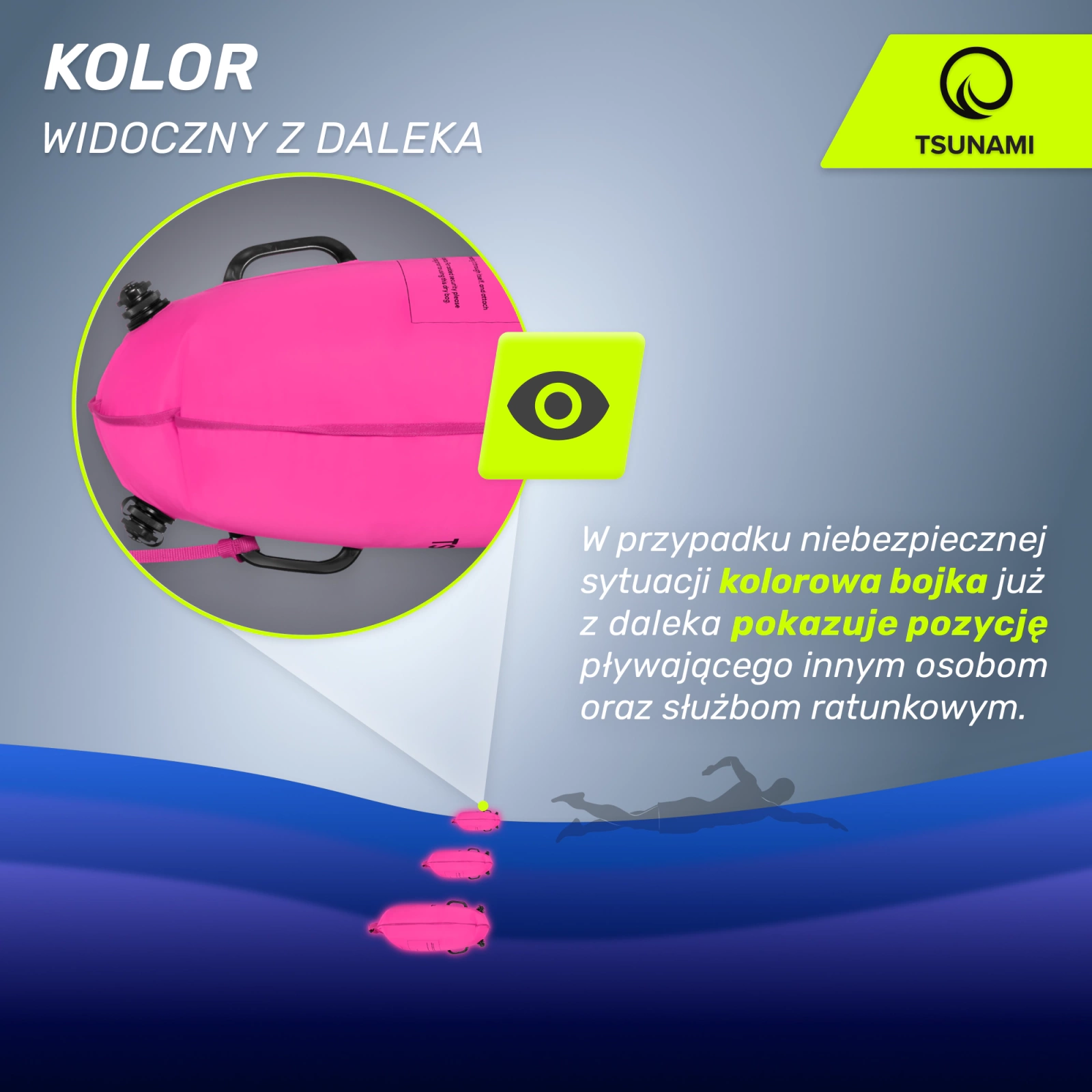 Biztosítsa biztonságát és kényelmét úszóedzés vagy szabadidős úszás közben a nyílt vízben. Ússzon egy felfújható bójával, amely növeli a vízben való láthatóságát, és görcs vagy váratlan erőcsökkenés esetén támpontot nyújt. A biztonság az úszás sarokköve, és a TSUNAMI mentőbója, maximálisan növeli ezt! Kényelmes a használata. A pumpáláshoz két kamerával rendelkezik, és a használatra való előkészítése körülbelül egy percet vesz igénybe.