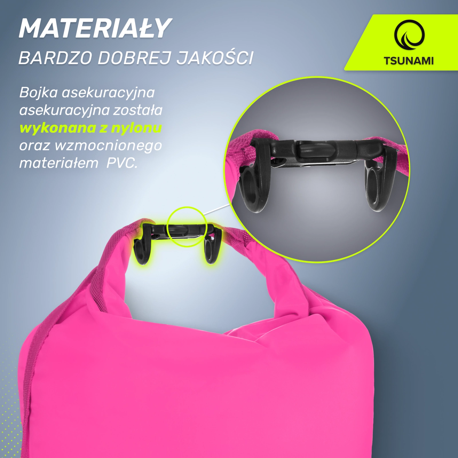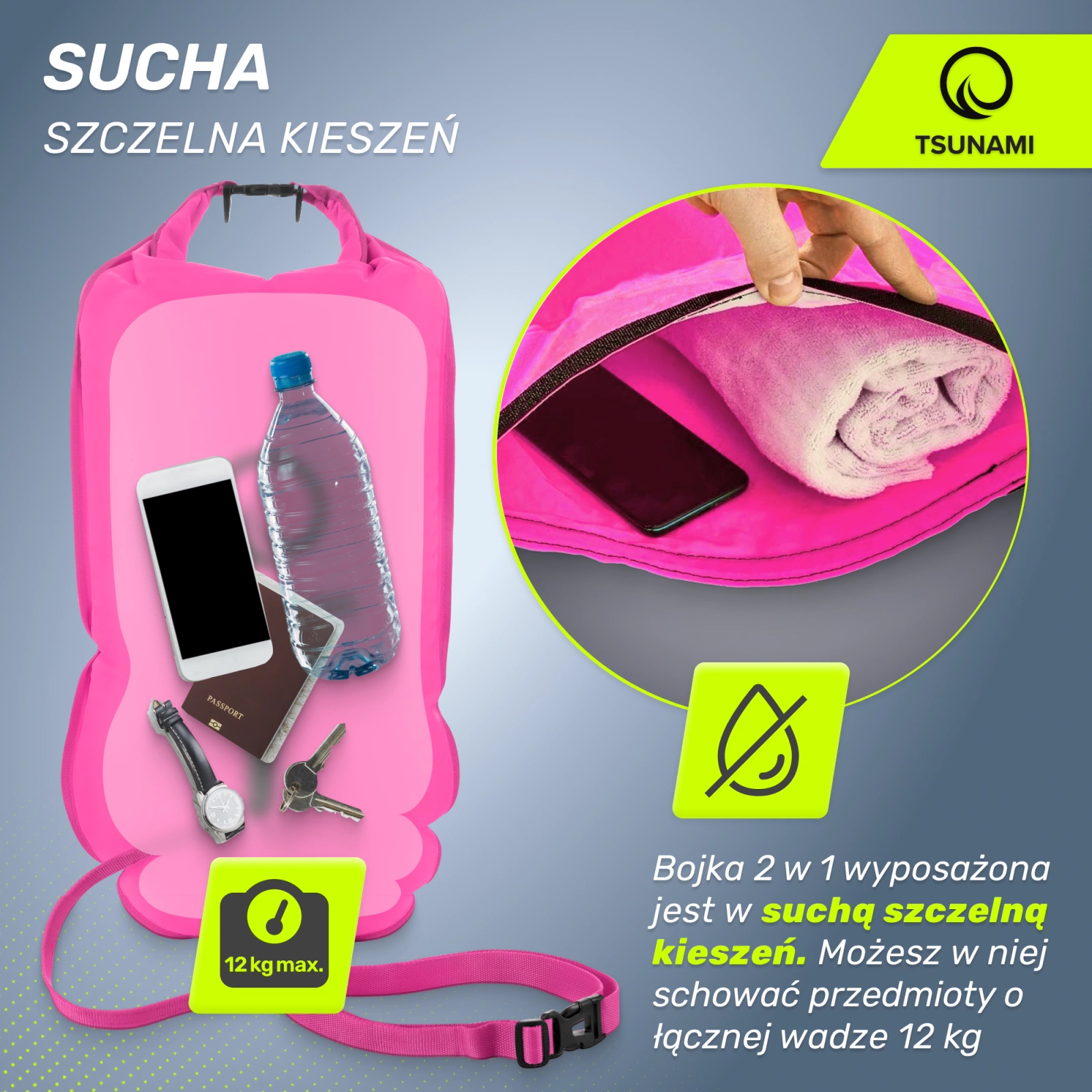 A TSUNAMI bója egy zárt zsebbel rendelkezik, ahol elteheti pénztárcáját, kulcsait, törölközőjét, cipőjét és ruháit. A zseb a bója teljes felületén belül található. Minden elfér benne, amit biztonságban kell tartania. A vízérzékeny tárgyakat meg kell védeni egy további vízálló tokkal, mielőtt a bójába pakolnád.