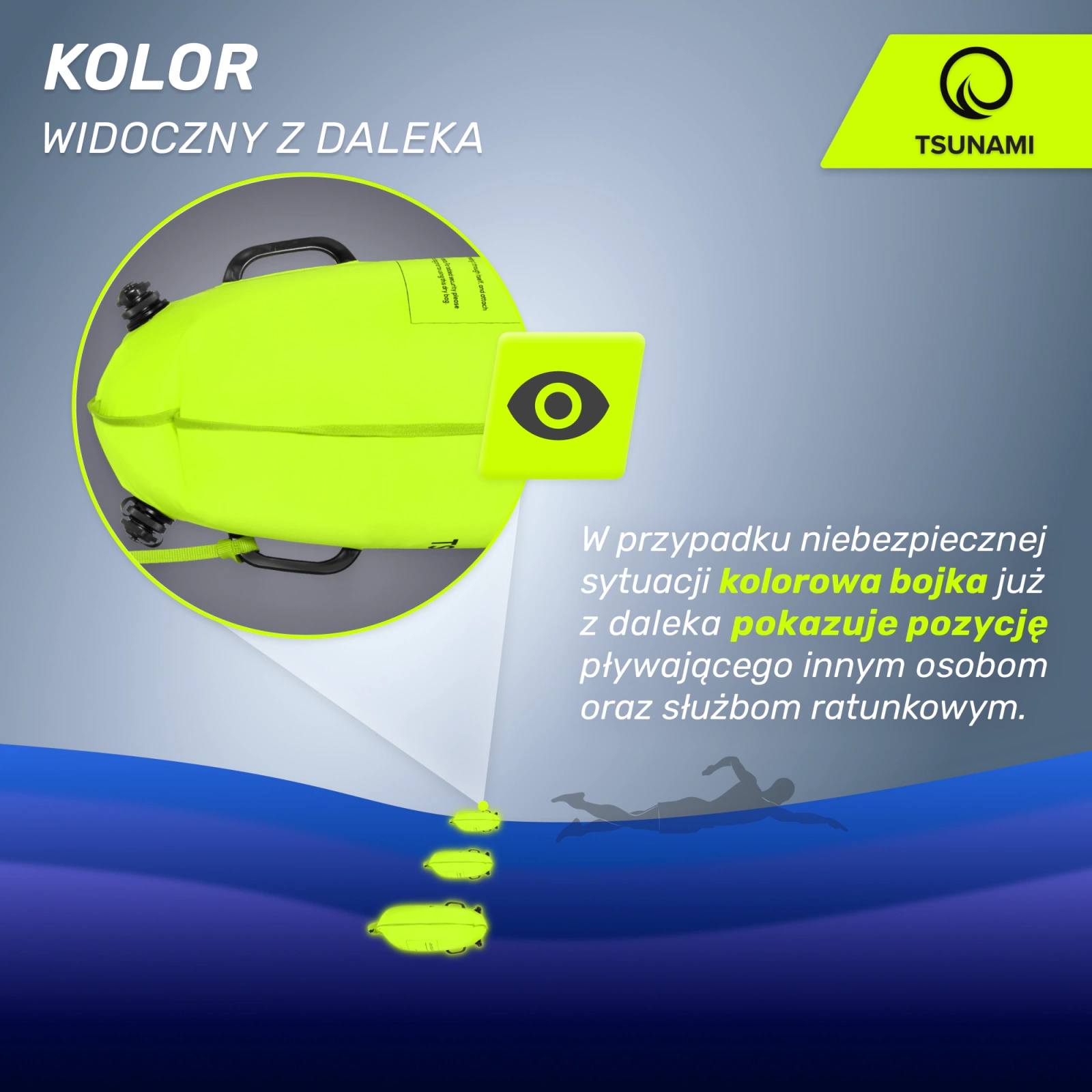 Ha rosszul leszel, elakadsz vagy görcsölsz, feküdj hanyatt a vízben, a fejed a bójának támasztva. Lazítson és pihenjen egy kicsit. Amikor szükséged van a bójára, hogy visszatérj a szárazföldre, fordulj hasra, tedd az egyik karod alá, és a másik karoddal és lábaddal dolgozz vele, mint a normál úszásnál. Színének köszönhetően a bója növeli a biztonságot a víz felett - intenzív színe van (jó láthatóságot biztosít). További előnyei a nagy felhajtóerő és száraz rekesz. Tartsa magát biztonságban a vízben, ha a felfújható TSUNAMI mentőbójával úszik.