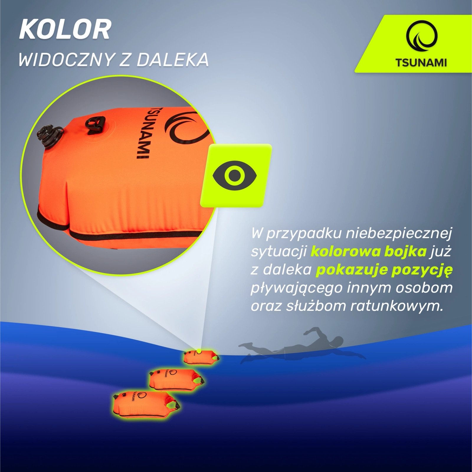 Biztosítsa biztonságát és kényelmét az úszóedzés vagy a szabadidős úszás során a nyílt vízben. Ússzon egy felfújható bójával, amely növeli a vízben való láthatóságát, és rögzítést biztosít görcs vagy váratlan erőből való esés esetén. A biztonság az úszás alapja, és a TSUNAMI biztosító bója, maximálisan növeli ezt!