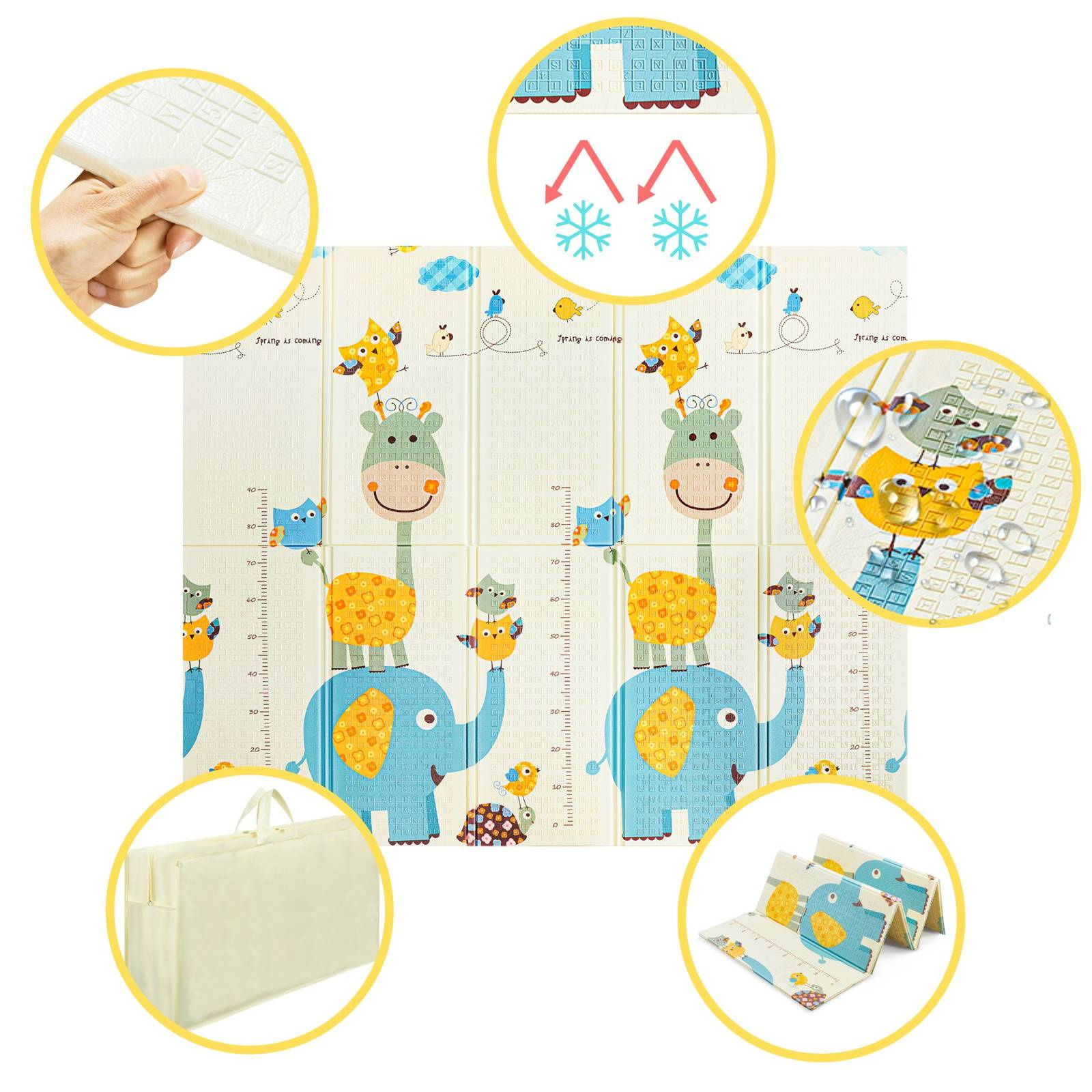 A csecsemőknek szánt hab oktatási szőnyegünk kétoldalas. A barátságos bálnát ábrázoló meseillusztrációk új dolgok felfedezésére, játékra és a képzelet fejlesztésére ösztönzik a kicsiket. Másrészt itt van az "Állati piramis". Az elefántot vagy zsiráfot ábrázoló visszafogott illusztrációk célja, hogy nyugodt hangulatba hozza a kisgyermeket. Ezen az oldalon egy mérő is található, amely lehetővé teszi a szülők számára, hogy nyomon kövessék, milyen gyorsan növekszik a gyermekük. Mindegy, melyik oldalt választod, az oktatószőnyeg biztonságos helyet nyújt - a csúszásgátló felület minimálisra csökkenti a csúszásveszélyt, míg a számok és betűk konvex textúrája a kicsik érzékszervi integrációját serkenti.