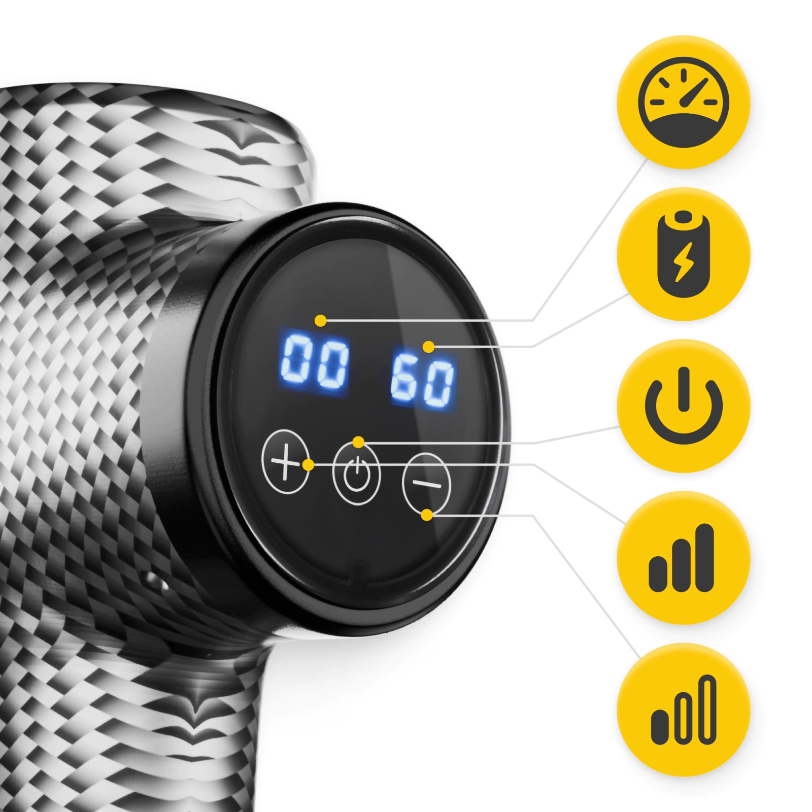 ▶️ 30 fokozatú sebességszabályozás – lehetővé teszi a masszírozó sebességének 1200 és 3800 fordulat/perc közötti beállítását, biztosítva a masszírozott testrészhez igazodó, sima teljesítménybeállítást.