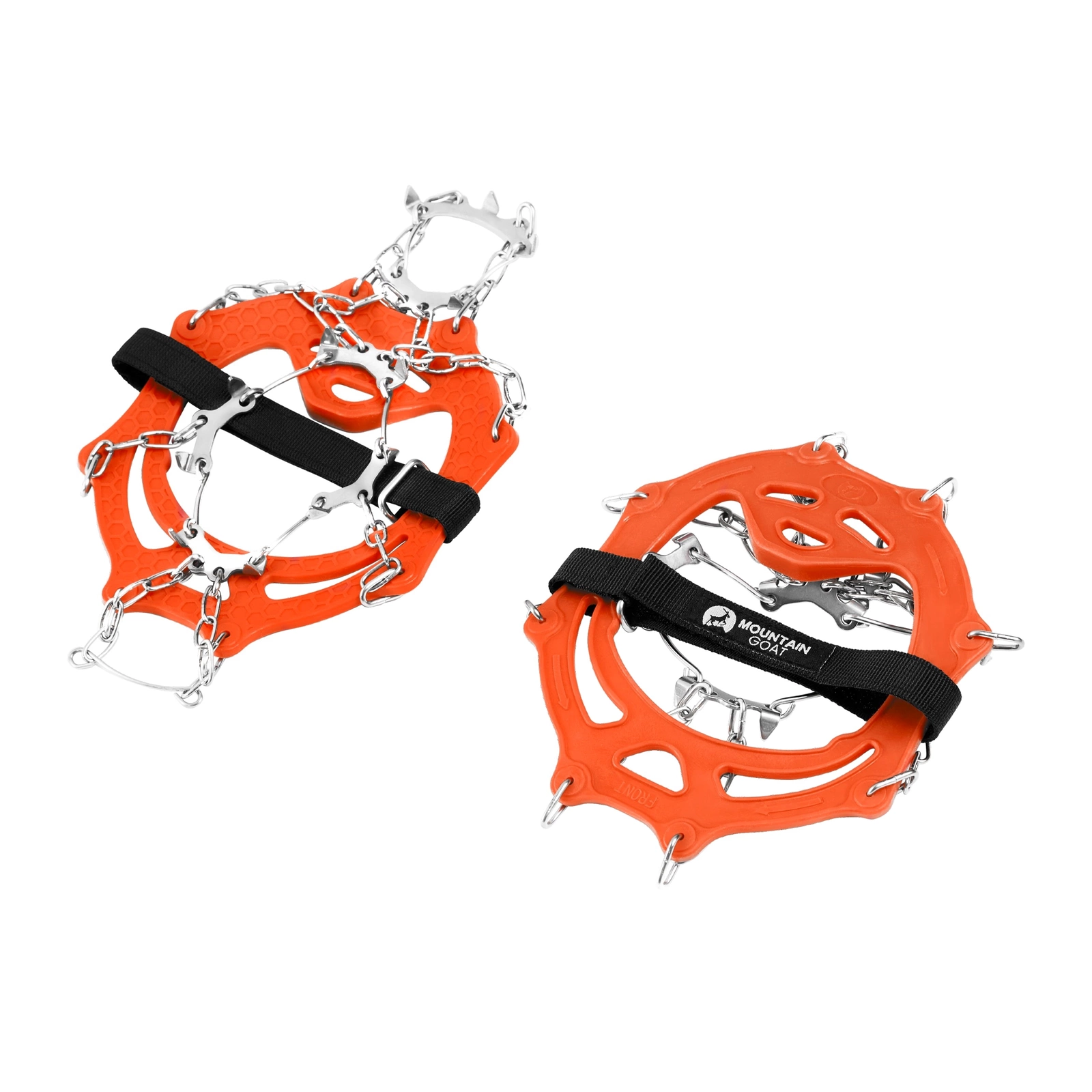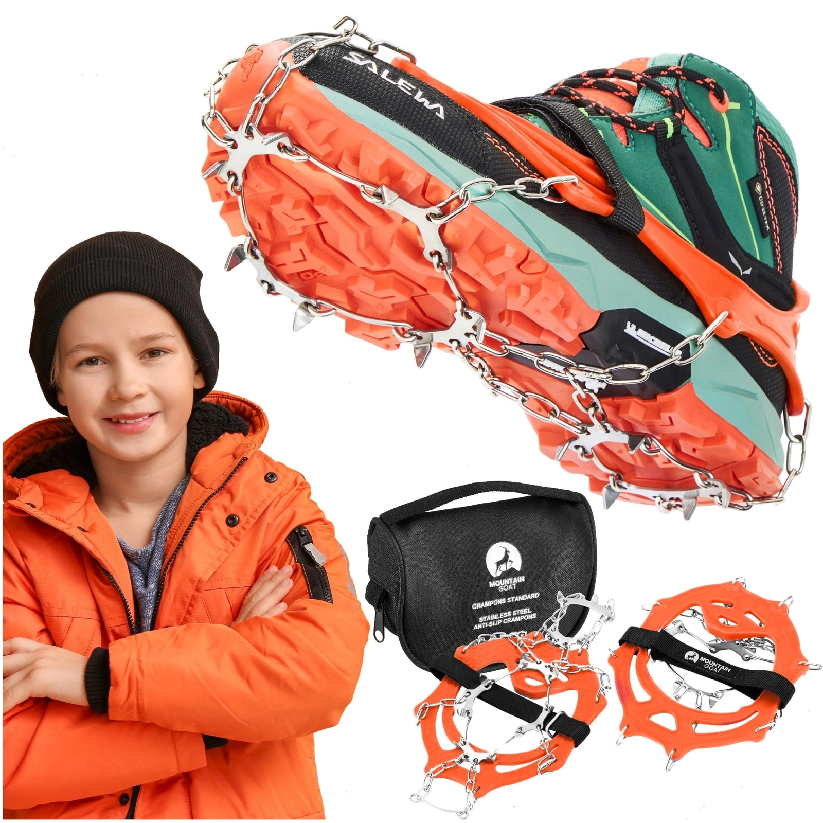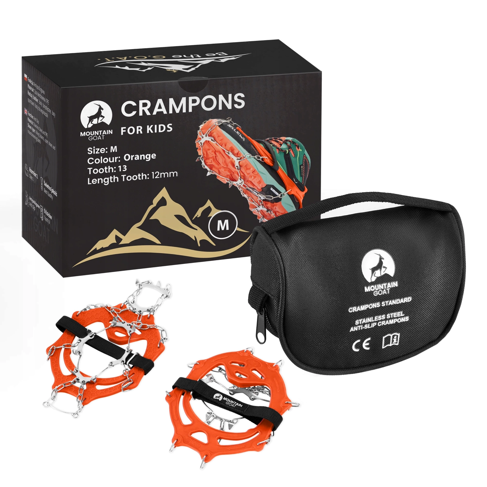 A MOUNTAIN GOAT gyerekbakancsra helyezhető csúszásgátló kiváló minőségű túrafelszerelés. A túraszett elengedhetetlen része, különösen akkor, ha hegyi kirándulást tervezel. Kirándulás közben biztosítsd gyermekeid számára a csúszós talajon való biztonságos tapadást. A jég vagy a fagyott hó sem jelent problémát a professzionális csúszásgátló használatával!