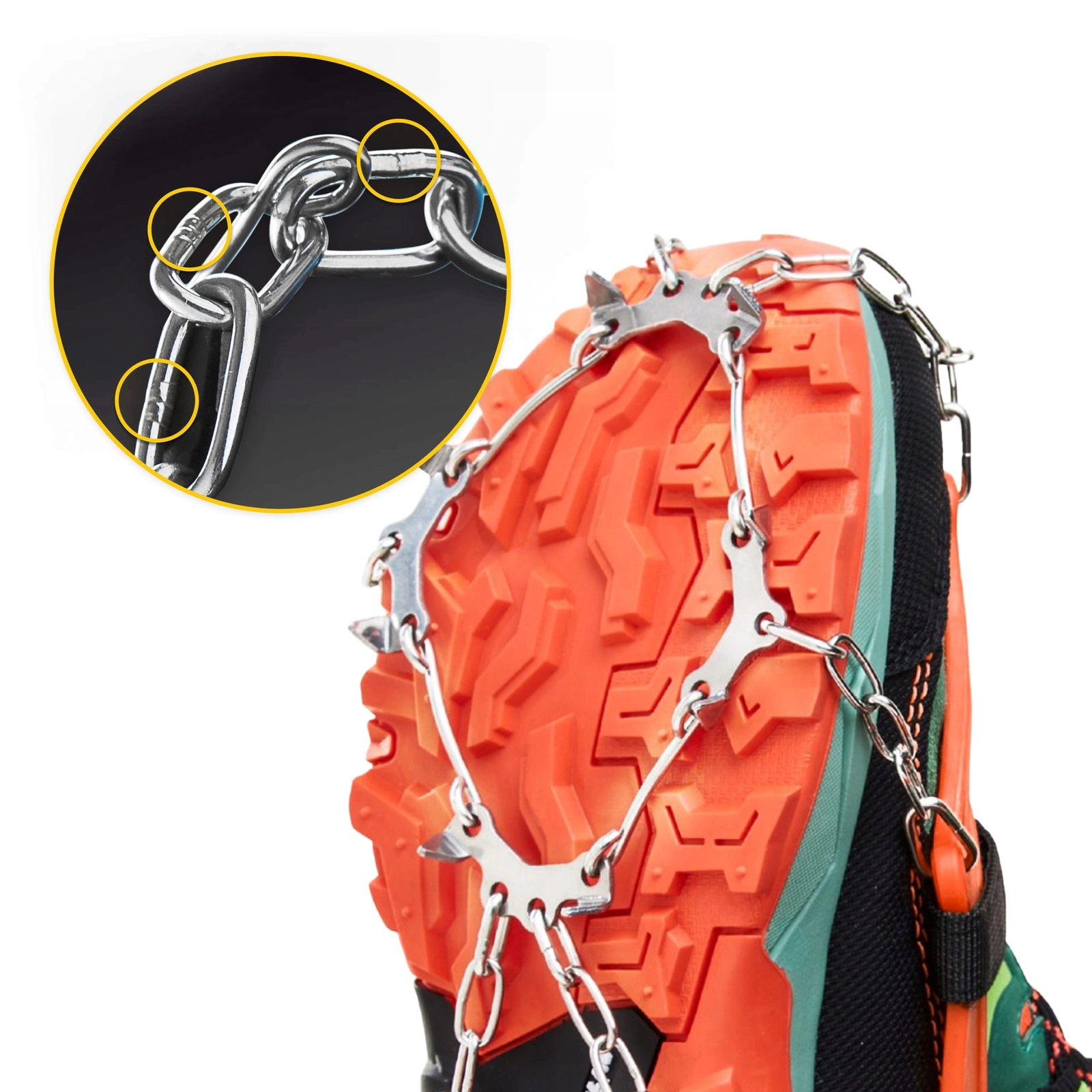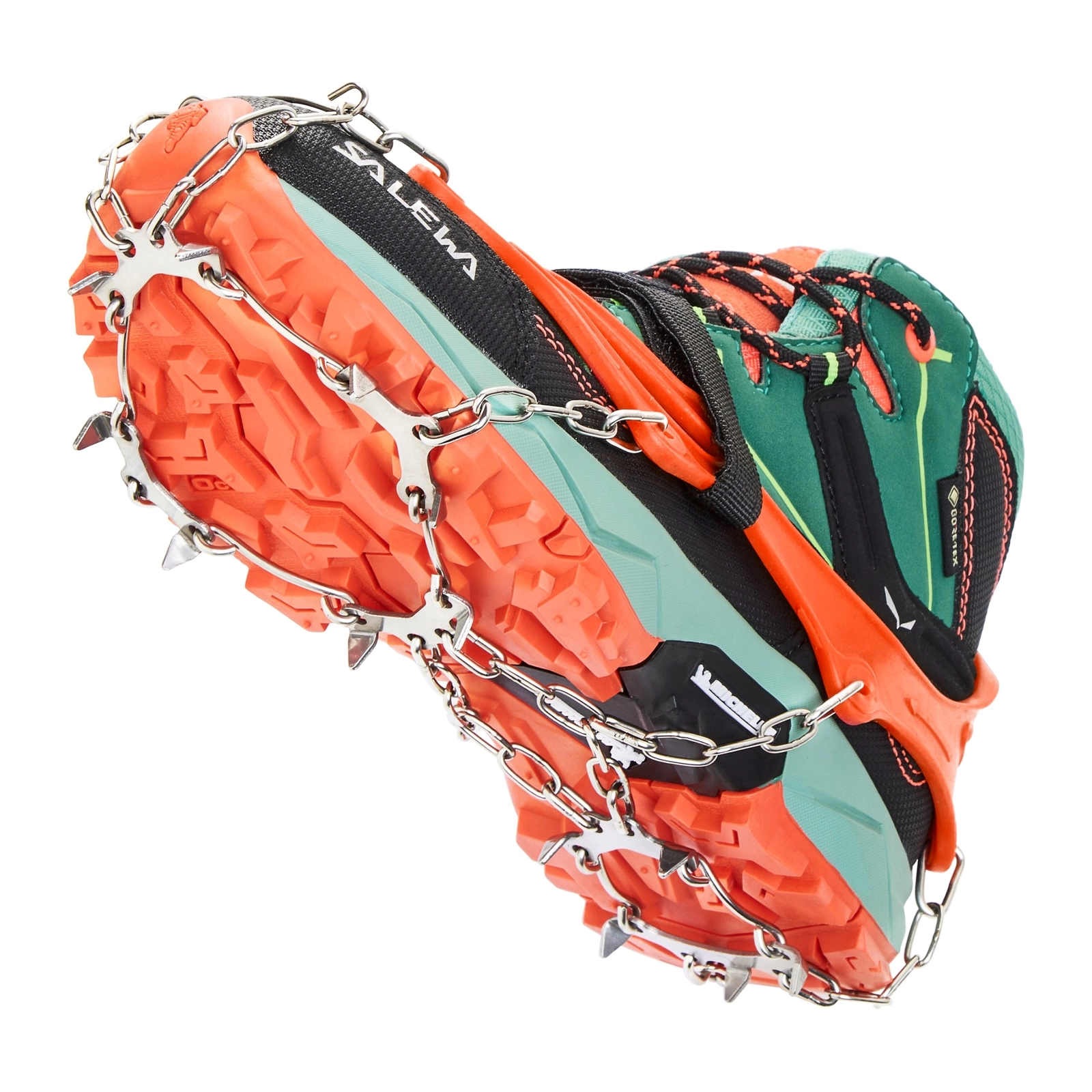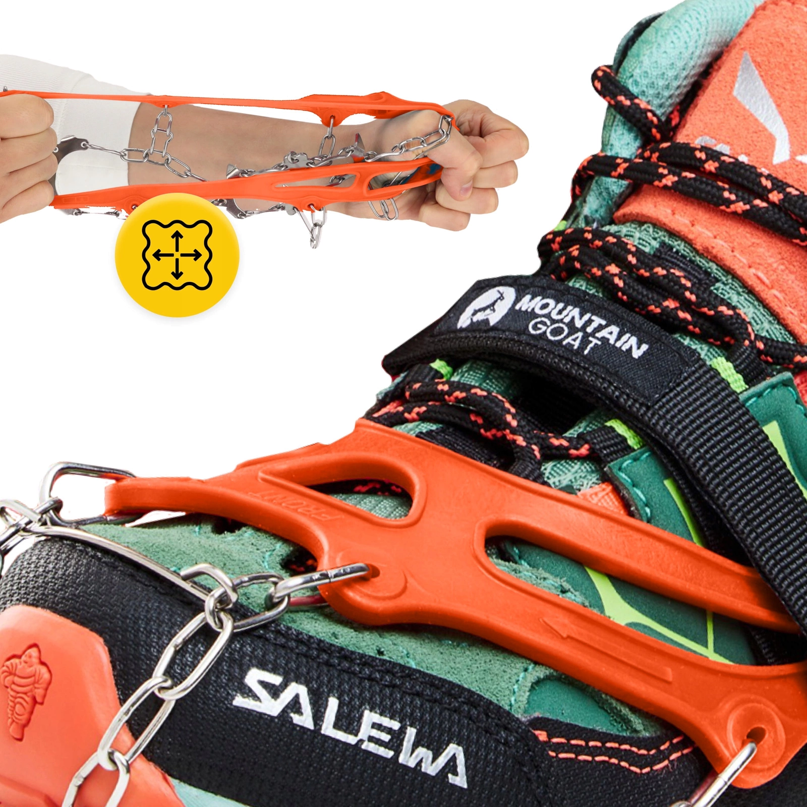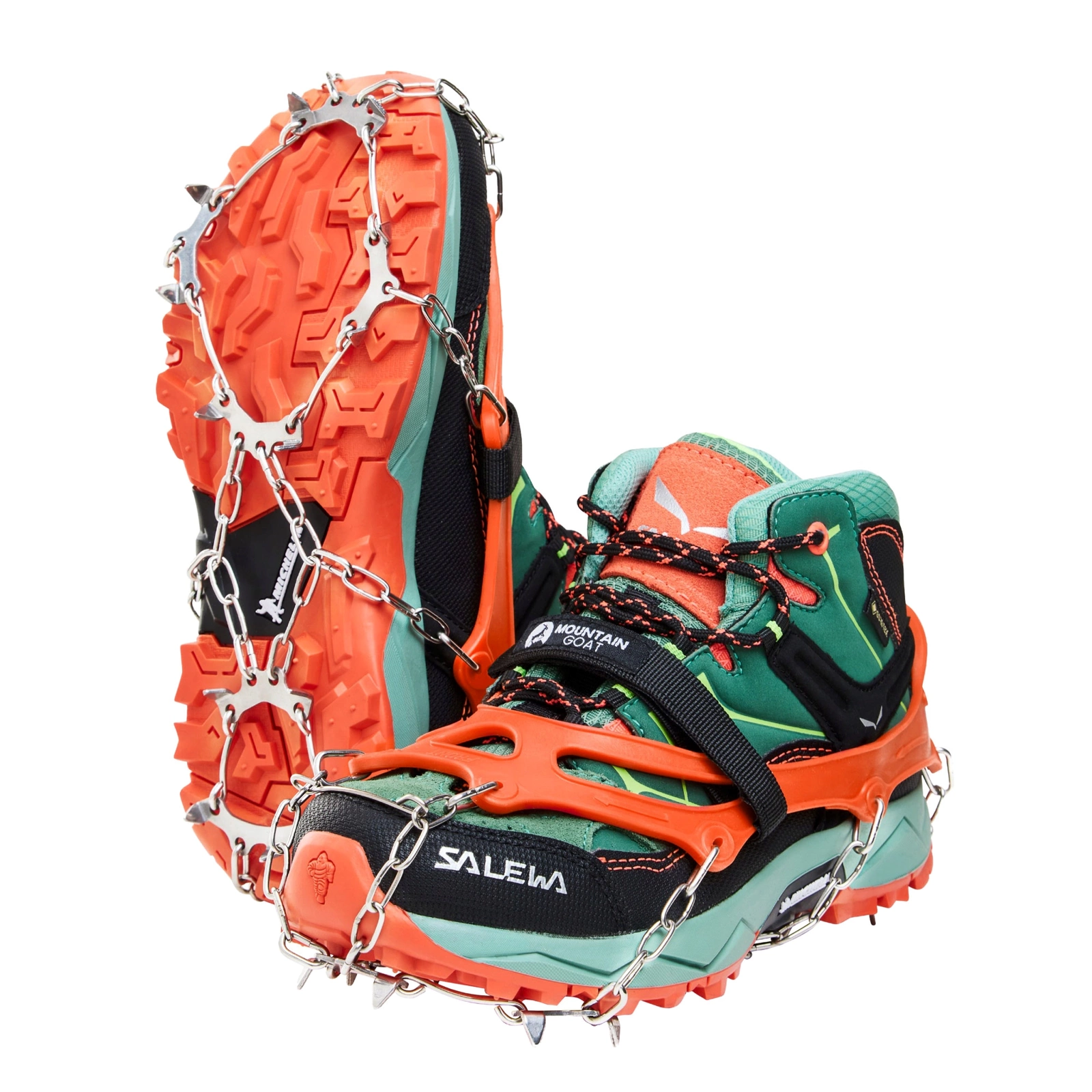A MOUNTAIN GOAT gyerekbakancsra helyezhető csúszásgátló kiváló minőségű túrafelszerelés. A túraszett elengedhetetlen része, különösen akkor, ha hegyi kirándulást tervezel. Kirándulás közben biztosítsd gyermekeid számára a csúszós talajon való biztonságos tapadást. A jég vagy a fagyott hó sem jelent problémát a professzionális csúszásgátló használatával!