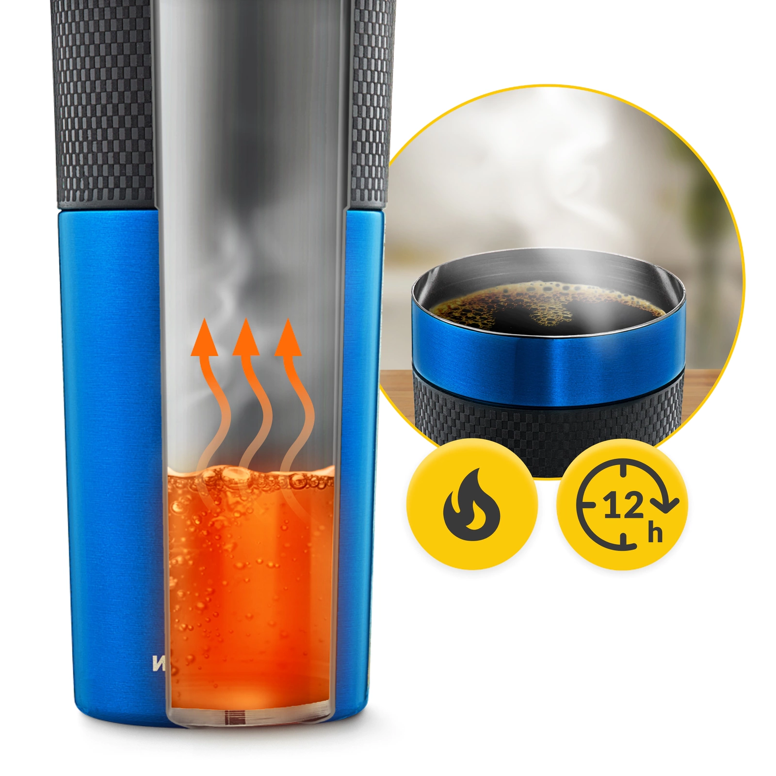 Kényelmes rozsdamentes acél hőbögre teához és kávéhoz.