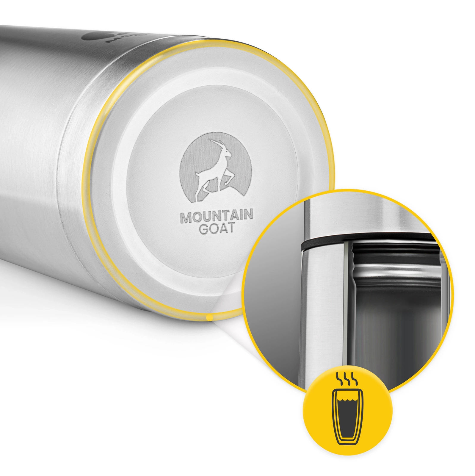 A MOUNTAIN GOAT duplafalú vákuumos túratermosz megőrzi a forró kávé vagy tea hőmérsékletét akár 12 órán keresztül.Ez azt jelenti, hogy akár több órás magashegyi túrázás után is nyúlhatsz egy csésze forró italért. És ez az élvezet lényege - a kedvenc forró kávéja egy csúcson, gyönyörű kilátással!