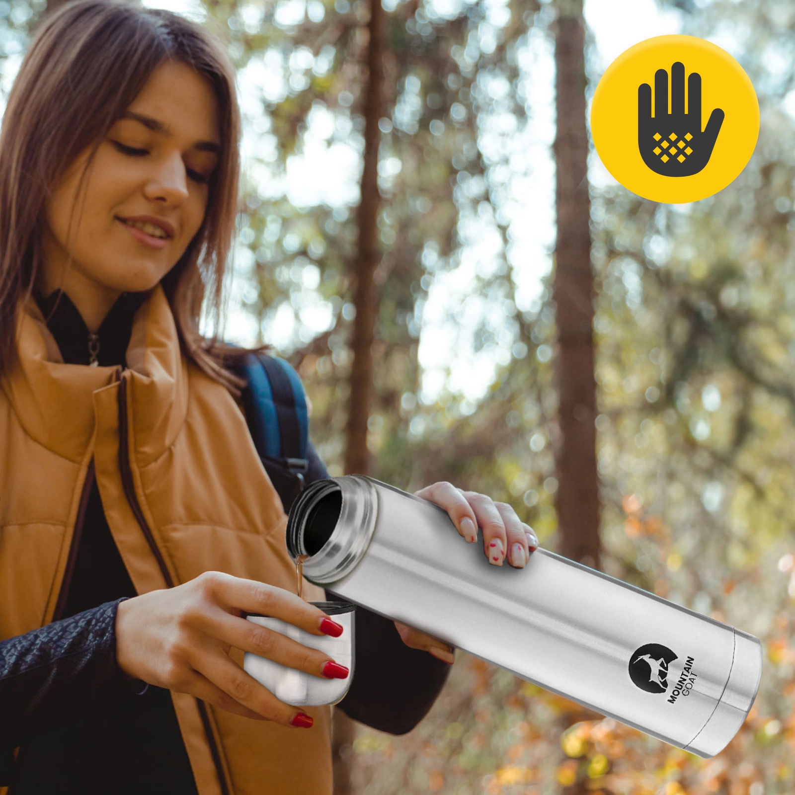 Ismeri azt az érzést, amikor belenyúl a hátizsákjába, és kiömlött a tea vagy a víz? Ilyen kellemetlen meglepetés soha többé nem fog veled megtörténni. A MOUNTAIN GOAT rozsdamentes acél vákuumos utazó termoszunk kettős védelemmel rendelkezik a kiömlés vagy szivárgás ellen. Ezt a funkciót a termosz csavaros kupakja és a csészeként használható kupak biztosítja. Így az ital nem fog kiömleni, még akkor sem, ha a termoszban nagy a nyomás.