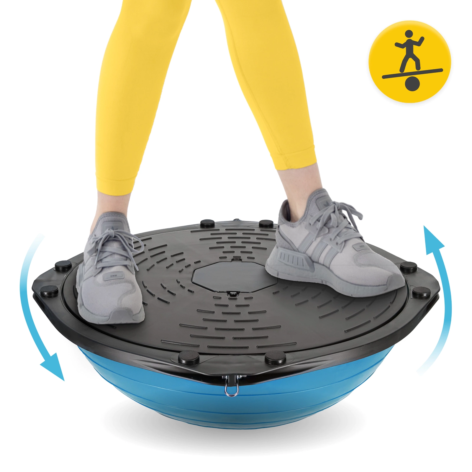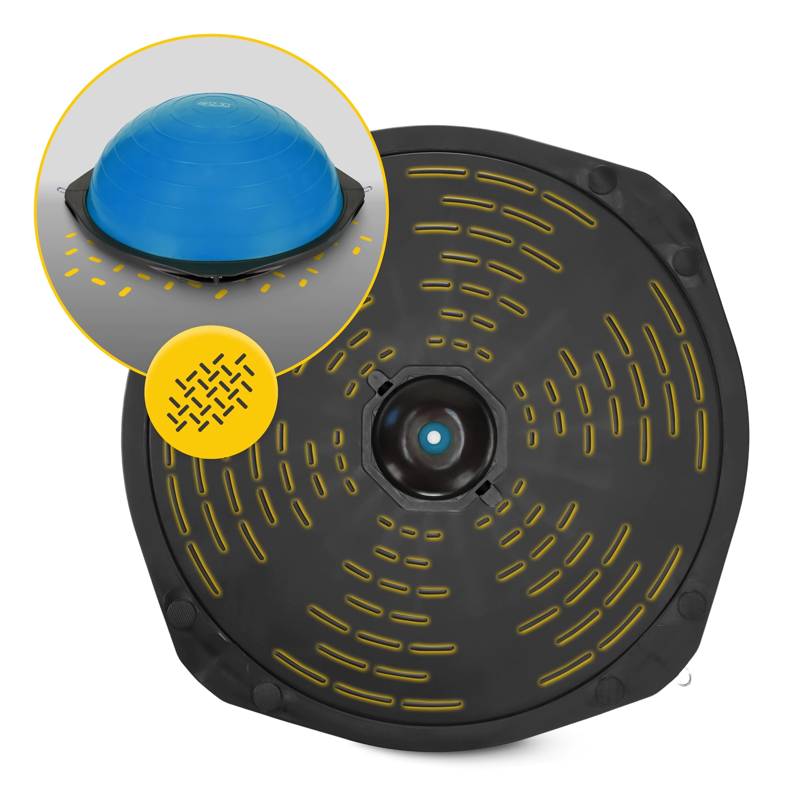 A 4FIZJO Balance Ball fél egy tornabál fél és egy egyensúlyozó platform kombinációja. Ez a kialakítás számos előnyt kínál - mindkét oldala változatos edzést tesz lehetővé. A félköríves kupola és az alap minőségű műanyagból készült a tartósság érdekében. A csúszásgátló megoldások, mint például a lábak vagy a speciális ovális vonalak, biztosítják a biztonságot edzés közben. Ezek védelmet nyújtanak a csúszás ellenés megakadályozzák a bosu típusú félgömb csúszását a testmozgás során. Az egyensúlyozó trénerhez 2 levehető tágító és egy pumpa tartozik