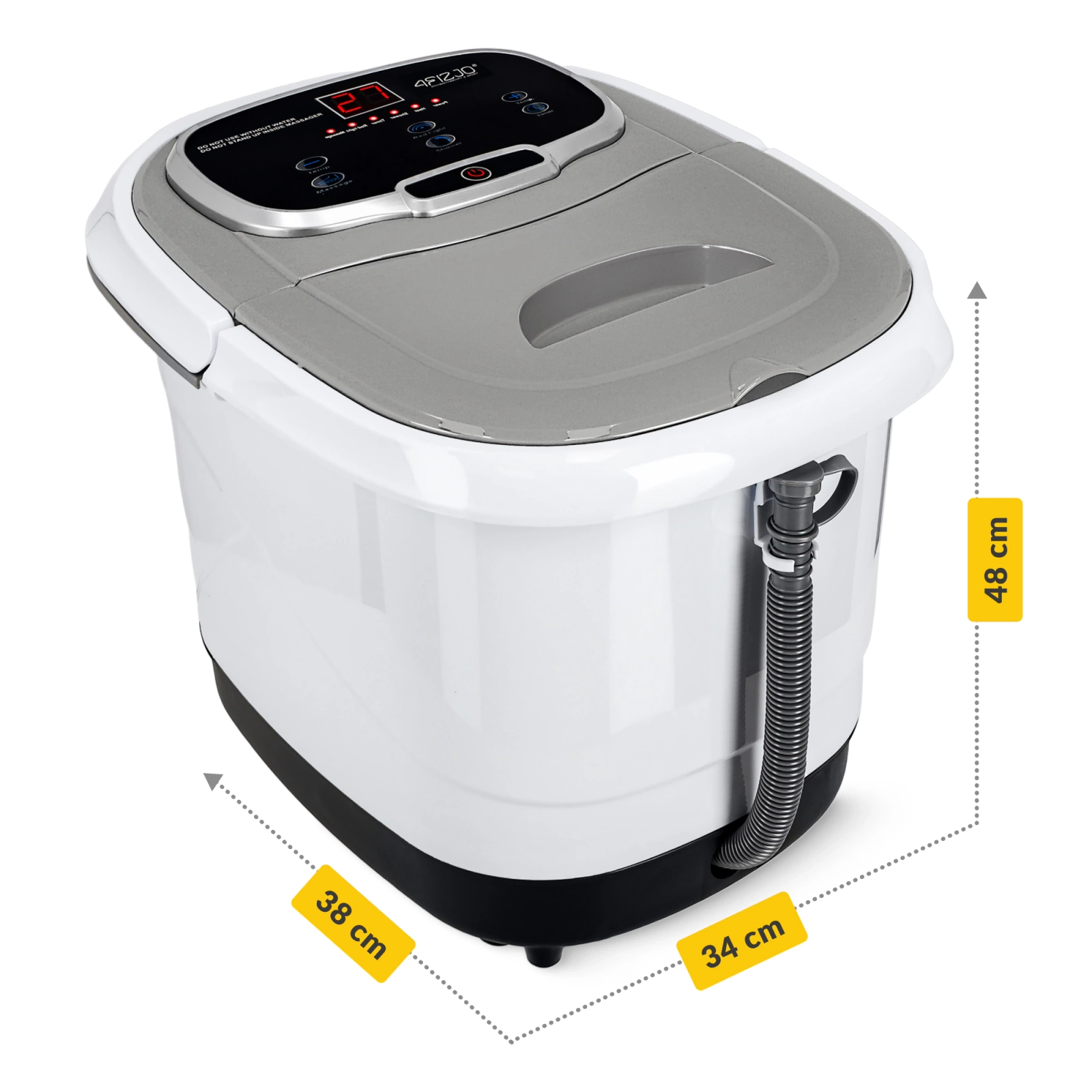A 4FIZJO vizes lábmasszírozó egy bevált és intuitívan használható elektromos készülék, amelyet magas minőség jellemez. tartós és könnyen tisztítható anyagból készült. A modern dizájn és a visszafogott színek a víz masszírozó különböző lakberendezési stílusokhoz illeszkedik. Ráadásul olyan helyen helyezheti el, amely az Ön számára kényelmes. A profilozott fogantyú megkönnyíti a masszírozó szállítását és a víztartály ürítését. A fogantyúnak köszönhetően a hidromasszázst könnyedén áthelyezheti bármely kívánt helyre. Annak érdekében, hogy a készülék használata a lehető legegyszerűbb legyen, érintkezős vezérlőpanellel és könnyen leolvasható LCD kijelzővel rendelkezik.