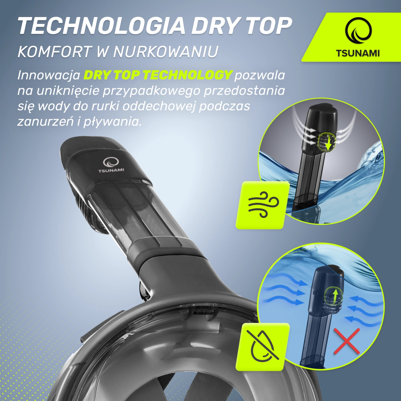 A búvármaszk búvármaszkban használt innovatív DRY TOP technológia hatékonyan megakadályozza a víz bejutását a maszkba. A speciális, golyóval ellátott snorkel kialakítása szabad légzést tesz lehetővé sznorkelezés közben. Ha a búvár teljesen alámerült, akkor a golyó automatikusan elzárja a snorkel nyílását, megakadályozva a víz beáramlását. Ennek a megoldásnak köszönhetően a vízbefulladás veszélye minimálisra csökken, növelve a kényelmet és a biztonságot a merülés során.