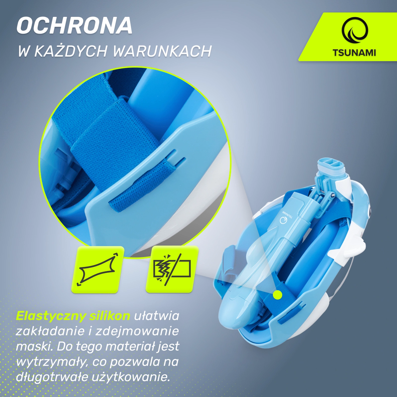 A TSUNAMI gyermek teljes arcú búvármaszk felejthetetlen élményt nyújt gyermekeinek a vízi tevékenységek során. Ez egy nélkülözhetetlen felszerelés minden tengerre vagy tóra tett kiránduláshoz. A maszk garantálja a biztonságot az úszás és a búvárkodás során, az érdekes bőrminta és a 3D elemek pedig változatossá teszik a vízben való szórakozást. A TSUNAMI maszk panorámás kilátással és kényelmes kialakításával maximális kényelmet garantál búvárkodás közben. Ez teljeskörű, ezért megengedi a szabad mozgást a felszínen és a víz alatt egyaránt, ami még izgalmasabbá tesz minden felfedezést.