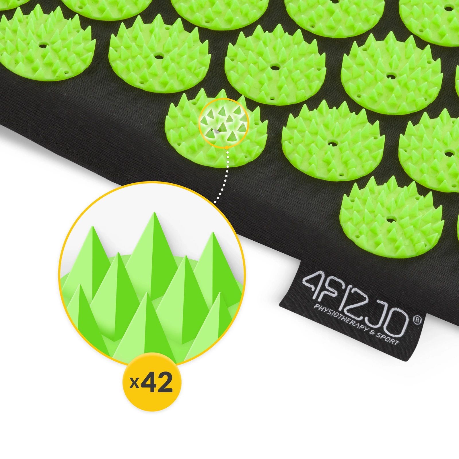 A 4FIZJO tüskés akupresszúrás szőnyeg kezdőknek és a nagyon érzékeny bőrűeknek ajánlott. Fontos, hogy a bőrre gyakorolt optimális nyomást válasszuk ki. Ezt puha hab és egyenes tüskék biztosítják. A könnyű hatás segít a test oxigénellátásában, javítja a vér- és nyirokkeringést. Az akupresszúrás masszázsban a nyomás intenzitása elsősorban a tüskék típusától és számától függ - minél több tüske van, annál gyengébb a masszázs.