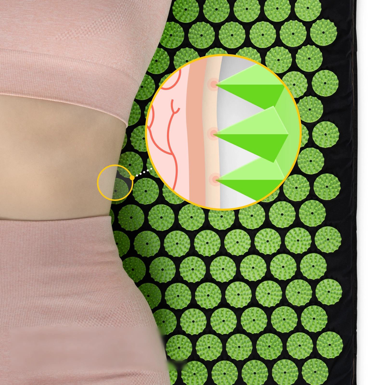 ALKALMAZÁS: Az akupresszúrás matracok hasznos eszközök a hátfájás, isiász kezelésében, segítenek ellazítani a feszült izmokat, miközben serkentik a keringési rendszer működését. Ezen felül pozitív hatással vannak a mentális egészségre is. Az akupresszúrás kiegészítőknek köszönhetően otthon magunk is elvégezhetünk egy ilyen masszázst. Az otthoni masszázshoz mindössze egy akupresszúrás szőnyegre vagy párnára van szükségünk. Ezek műanyagból készült, nyomáspontokkal ellátott rozettákkal - úgynevezett tüskékkel - vannak ellátva.