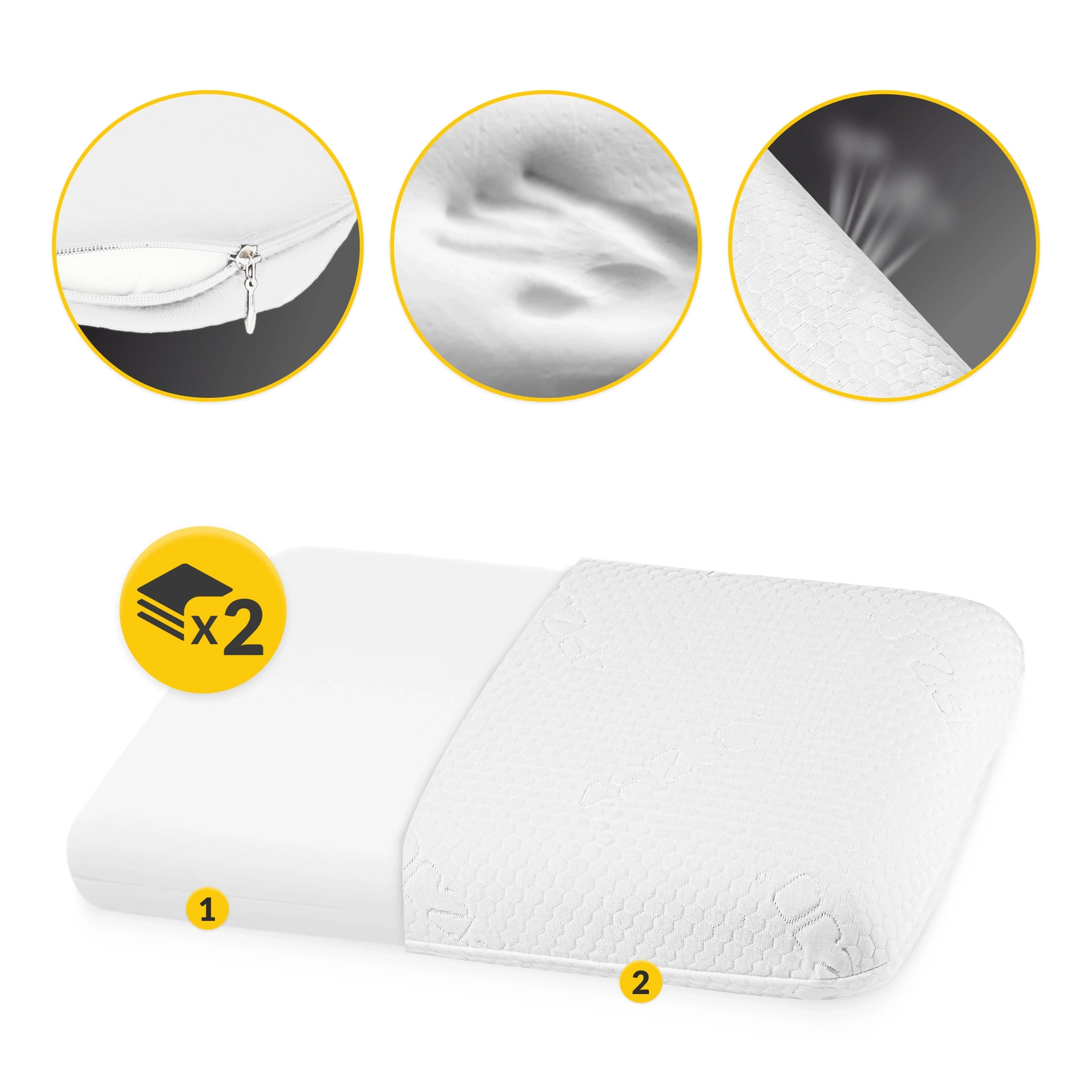 1️⃣ Puha és kellemes anyagból készült párnahuzat - cipzárral záródik és könnyen levehető. Lélegző és alacsony hőmérsékleten gépben mosható.