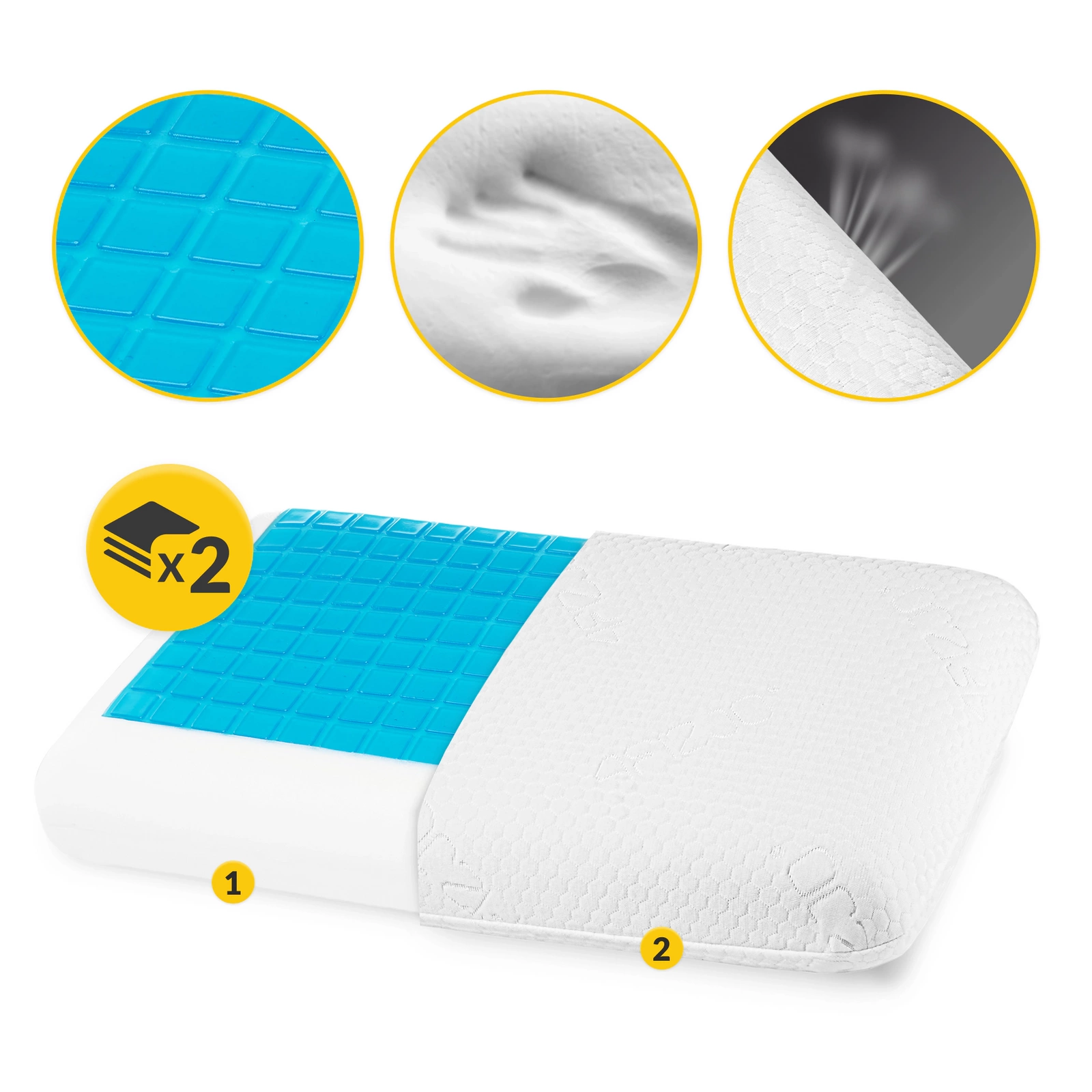 2️⃣ Hűtő gélbetét - az innovatív hűtő géltechnológia további pihenést és kényelmet biztosít a felhasználó számára. 3️⃣ VISCO Memory Foam - rugalmas anyag, amely tökéletesen illeszkedik a test alakjához.