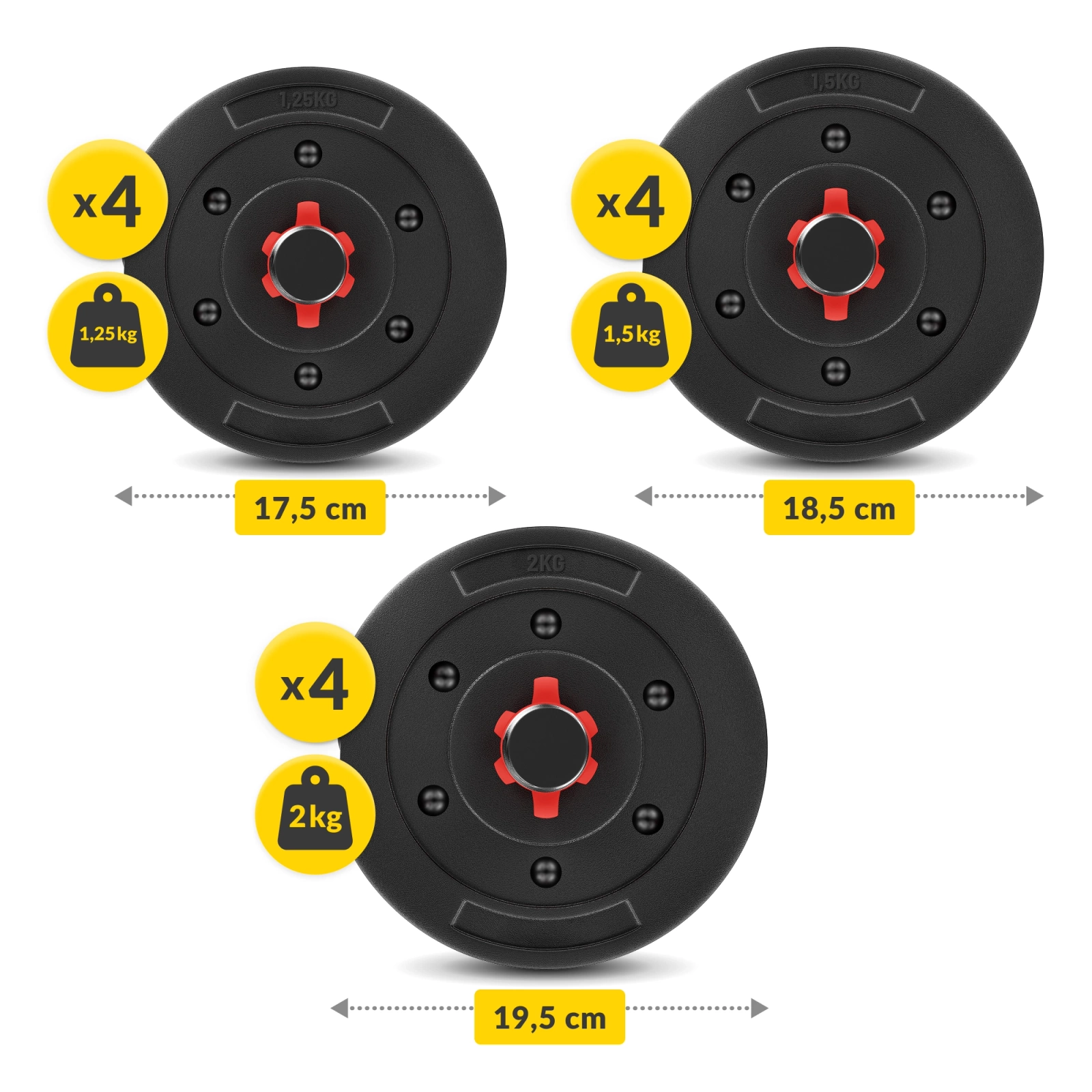 ▶️ A készlet 12 különböző súlyú lemez lehetővé teszi a megfelelő terhelés kiválasztását minden egyes gyakorlathoz, de az edző személy szintjéhez is.