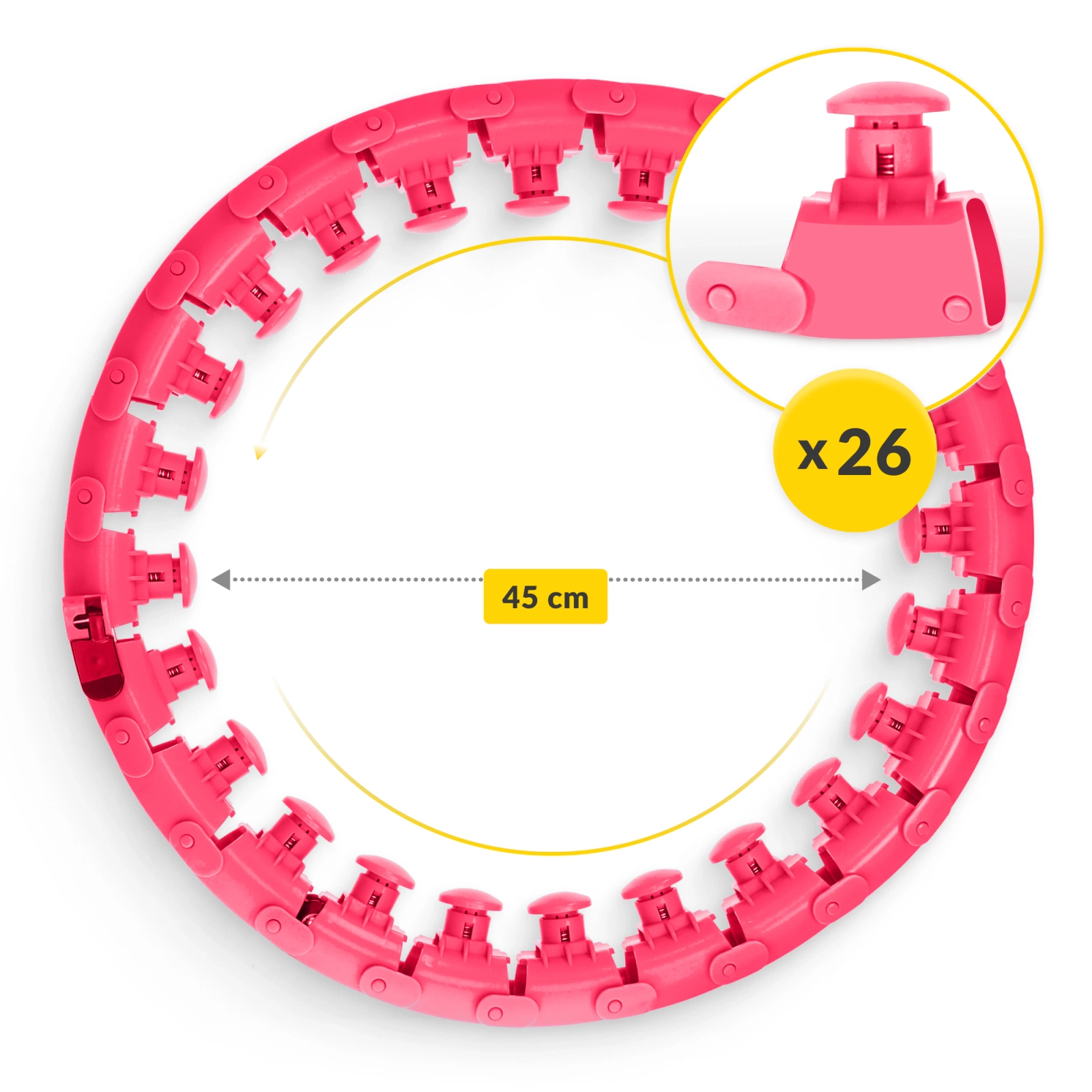 A 4FIZJO súlyozott és masszázspontokkal ellátott hullahopp karika állítható derékpánttal és kerülettel rendelkezik, így személyre szabható és még hatékonyabbá tehető a használata. A gyűrű mérete 15–26 elemből állítható össze, ami 50 és 120 cm közötti derékbőséget jelent. A méret egyszerűen módosítható elemek hozzáadásával vagy eltávolításával.